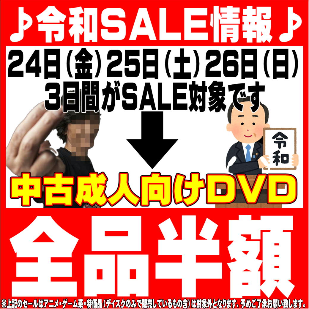 5月24~26日迄の3日間、アダルト中古DVD半額セールをやっちゃいます!