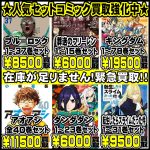 最新コミック買取強化中!!! 人気タイトルのコミックを買取強化中です。 価格は会員様価格になります。 在庫状況により価格は変動致します。 お気軽にお問い合わせください。 タ イ ト ル 巻数 買取額 …
