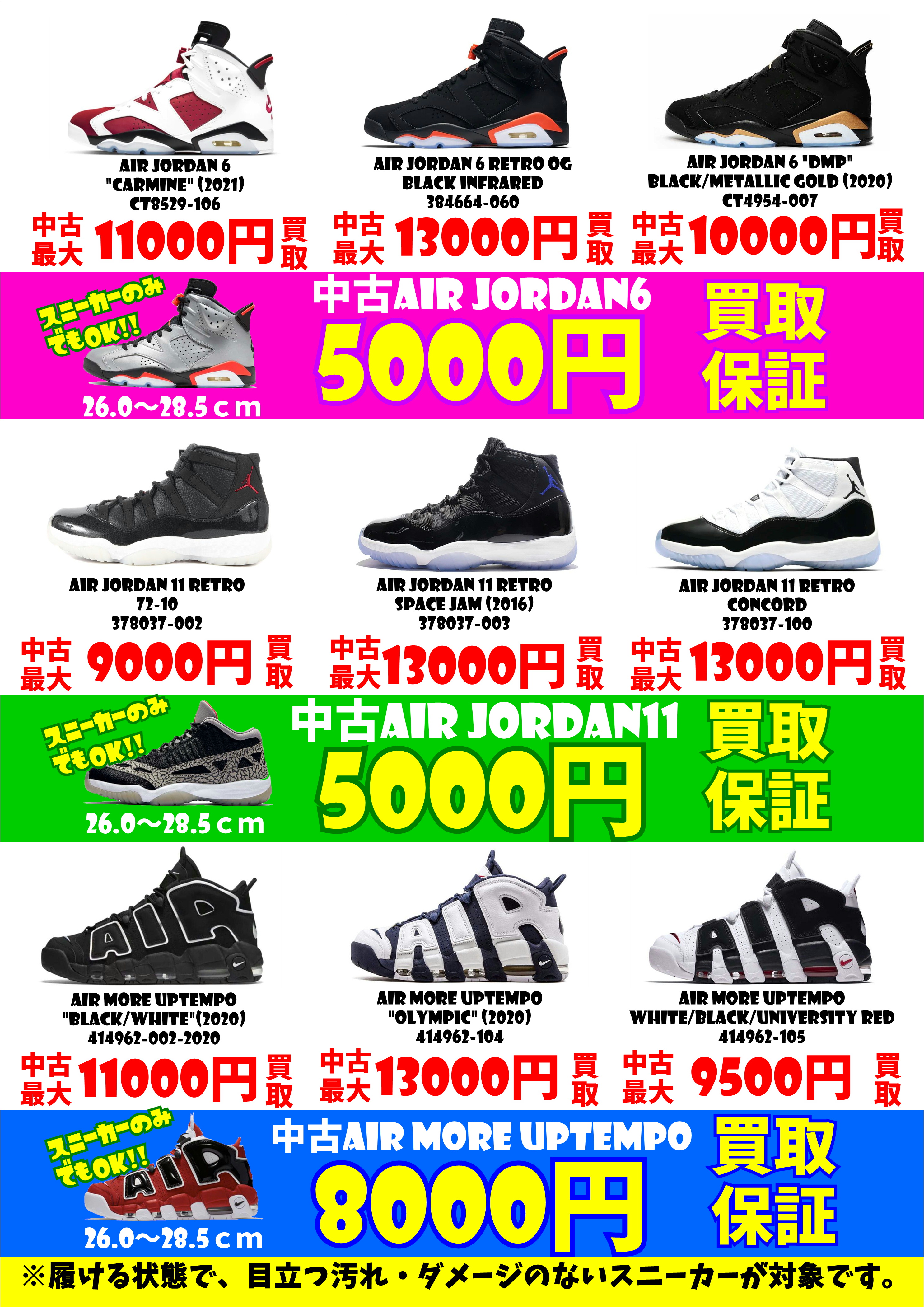 NIKEスニーカー、買取強化中! JORDAN 6、中古最低5000円買取保証! JORDAN 11、中古最低5000円買取保証! モアテン、中古最低8000円買取保証! 目立つキズ汚れ、ダメージが無ければOK! NIKEスニーカー、地域ナンバー1、高価買取!