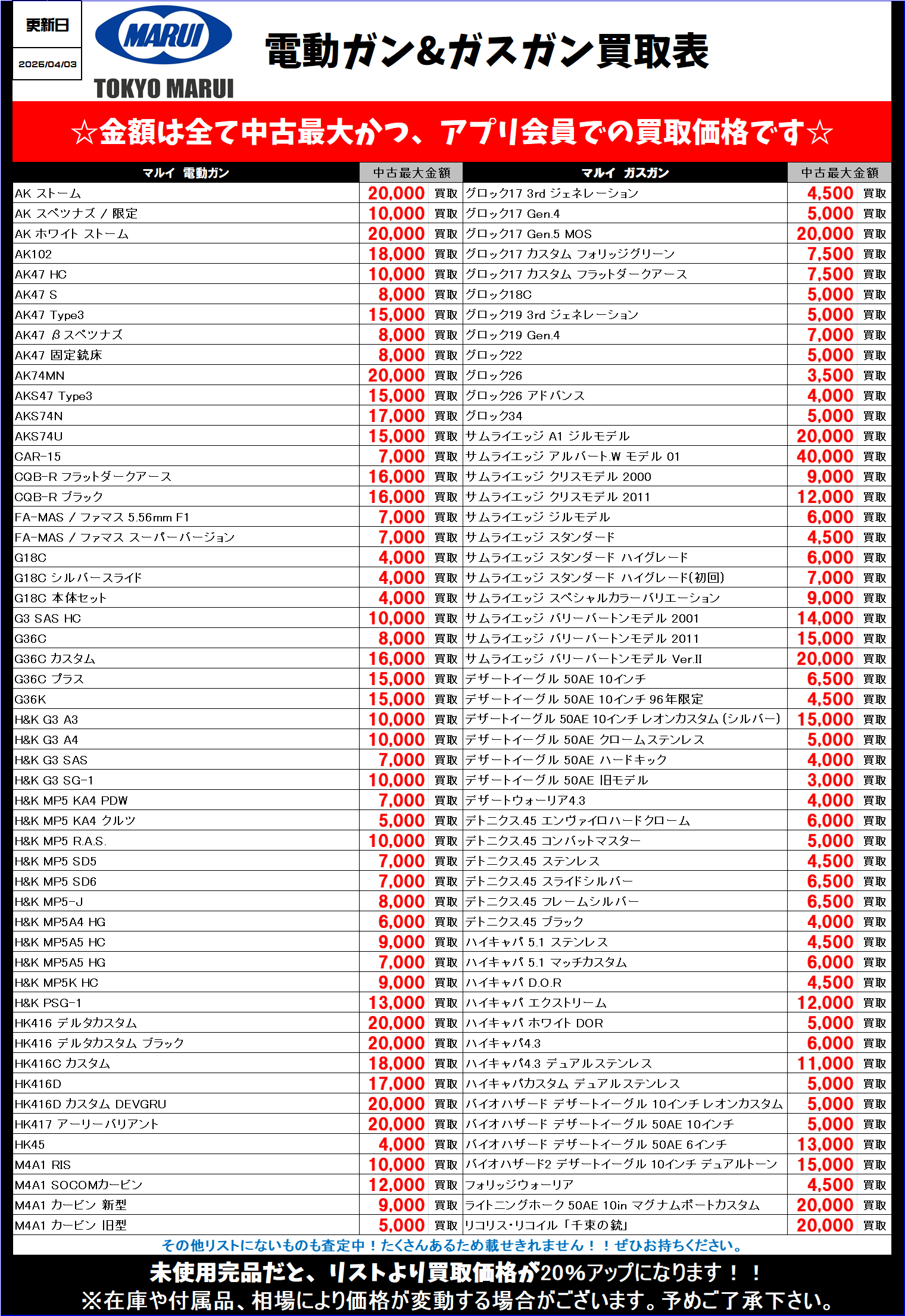| 東京マルイ(ガスガン)買取表 | 更新日 | |||