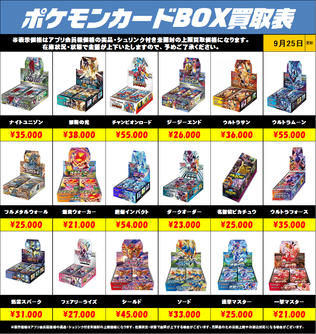 未開封・美品・メーカーテープ付きの店頭・アプリ会員様の買取価格を表示しております。 予告なく在庫により金額が上下する場合と買取上限や、お振込対応になる場合がございます。 BOXの状態によりお買取り出来 …