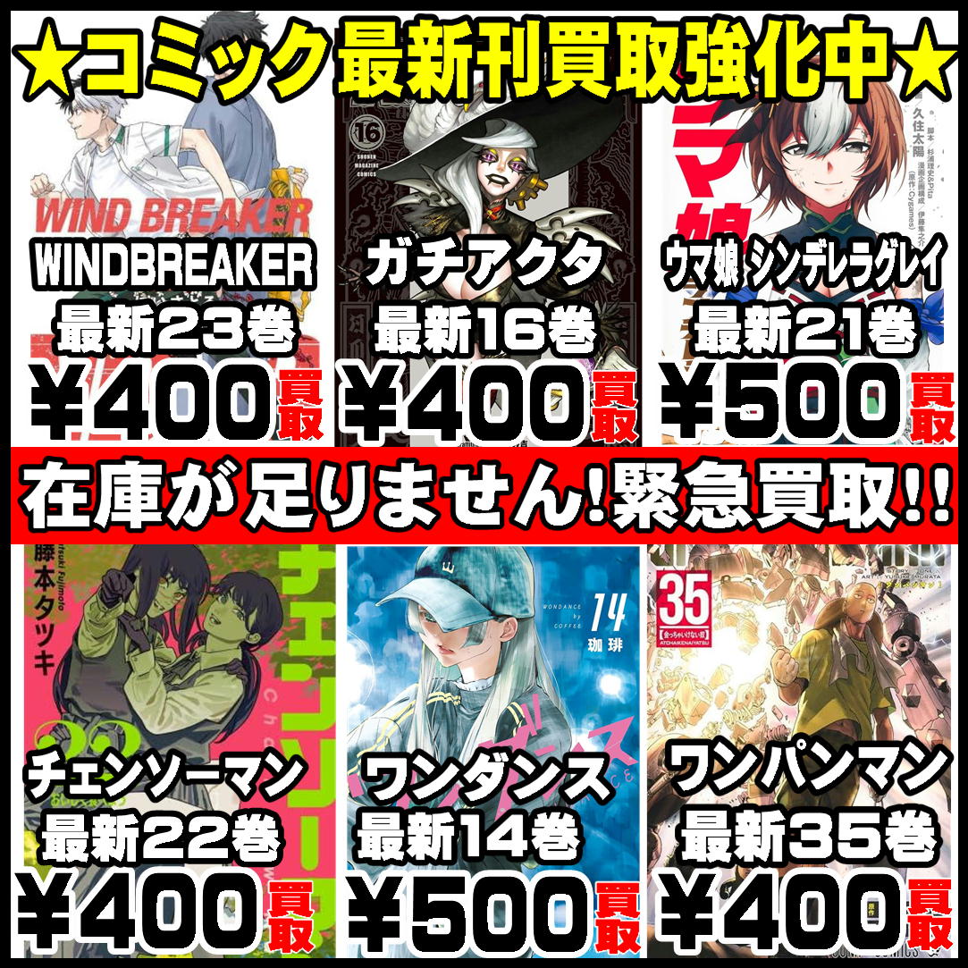 本 新刊コミック買取強化中!! 投稿日:2025年10月3日 ※状態、在庫により金額が変更する場合がございます。 在庫が集まり次第終了となる場合がございます。 共有:クリックして Twitter で共有 (新しいウィンドウで開きます)Facebook で共有するにはクリックしてください (新しいウィンドウで開きます) Twitter Facebook Google+ Pocket B!はてブ LINE -本 執筆者:funabashi