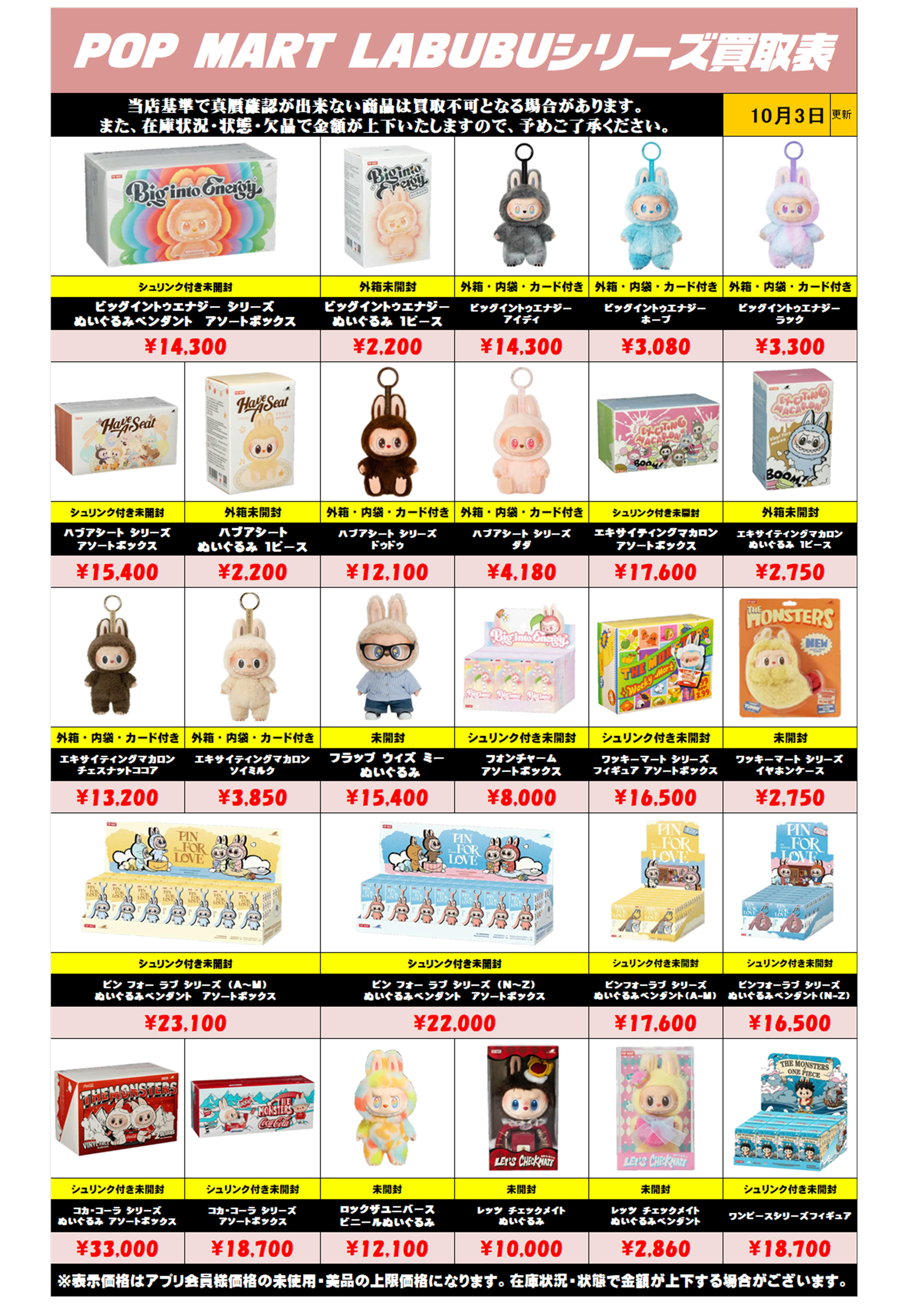 また、在庫状況・状態・欠品などでの金額が変動や、買取上限がございます。予めご了承ください。