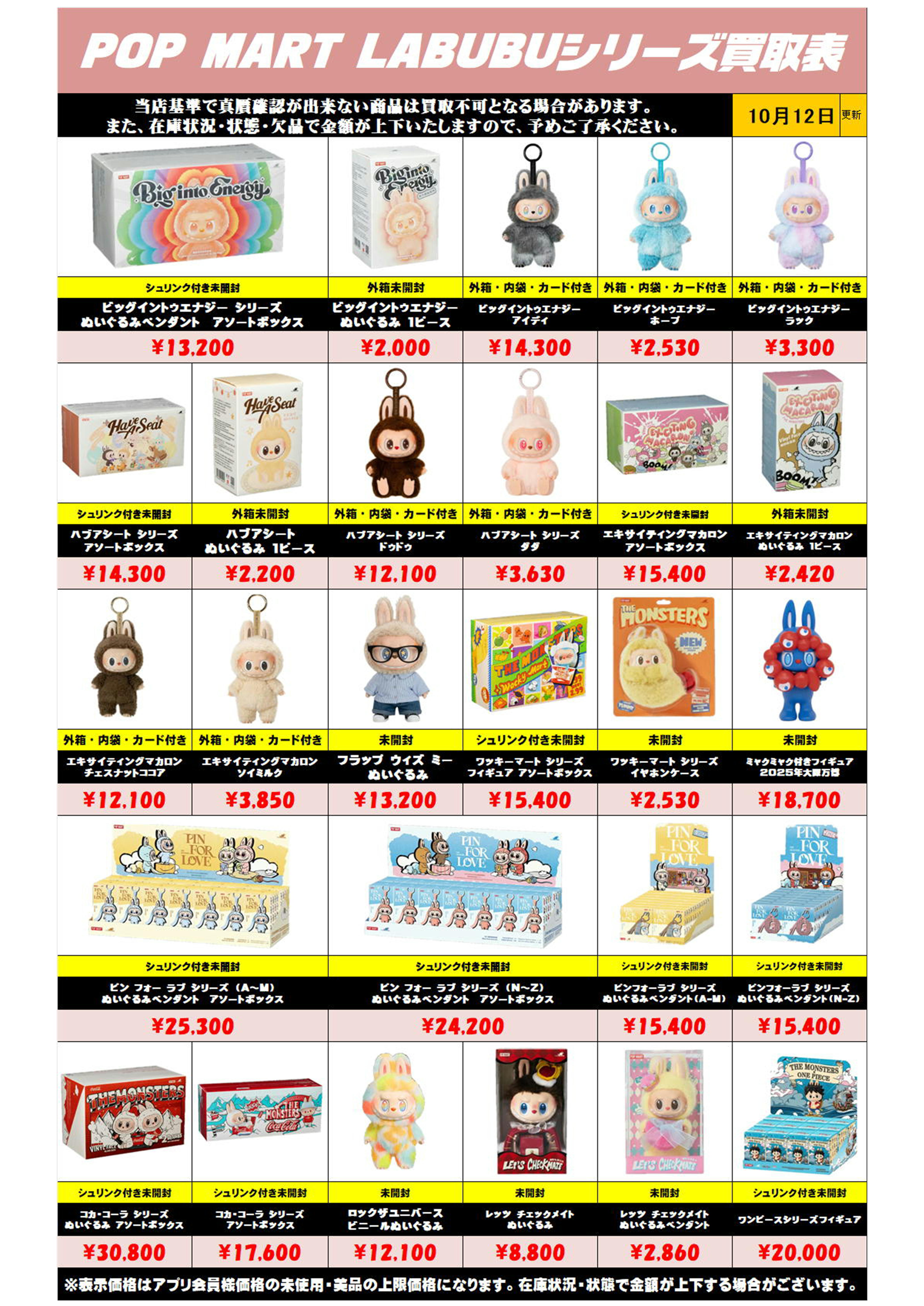 また、在庫状況・状態・欠品などでの金額が変動や、買取上限がございます。予めご了承ください。