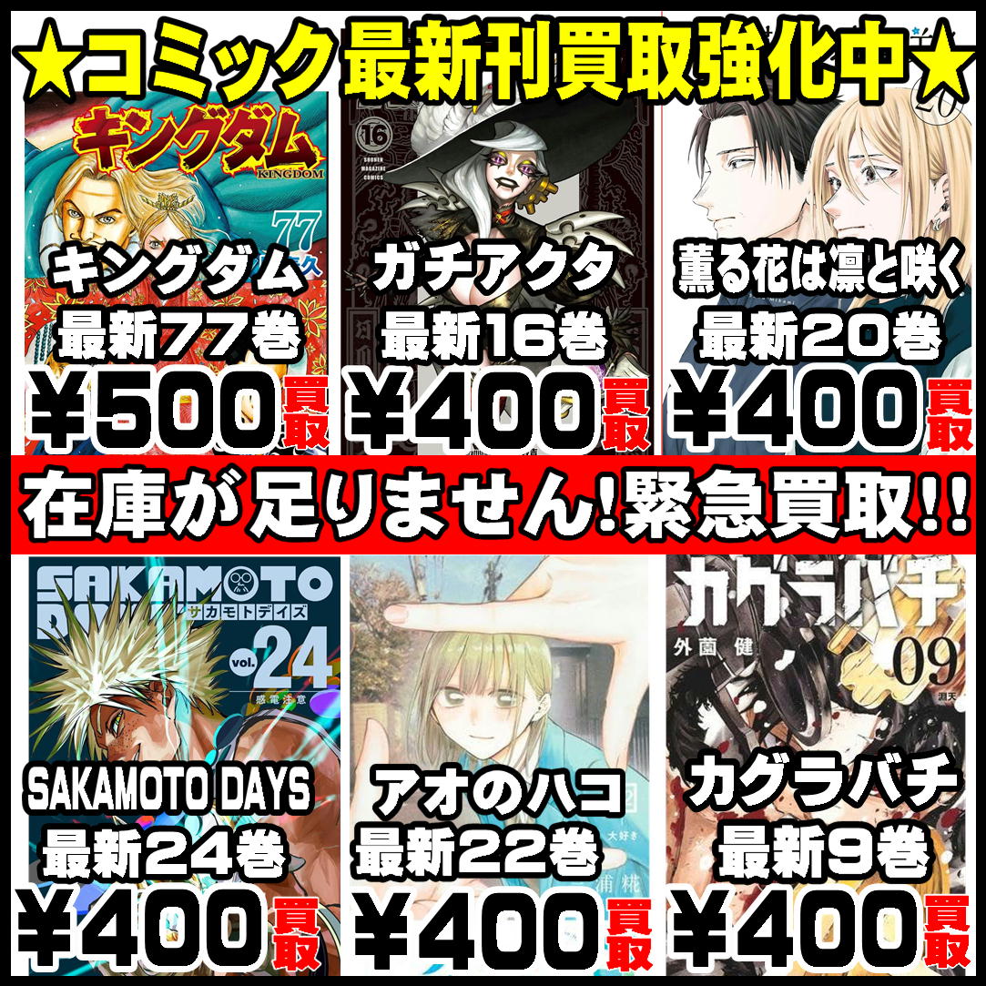 本 新刊コミック買取強化中!! 投稿日:2025年10月17日 ※状態、在庫により金額が変更する場合がございます。 在庫が集まり次第終了となる場合がございます。 共有:クリックして Twitter で共有 (新しいウィンドウで開きます)Facebook で共有するにはクリックしてください (新しいウィンドウで開きます) Twitter Facebook Google+ Pocket B!はてブ LINE -本 執筆者:funabashi