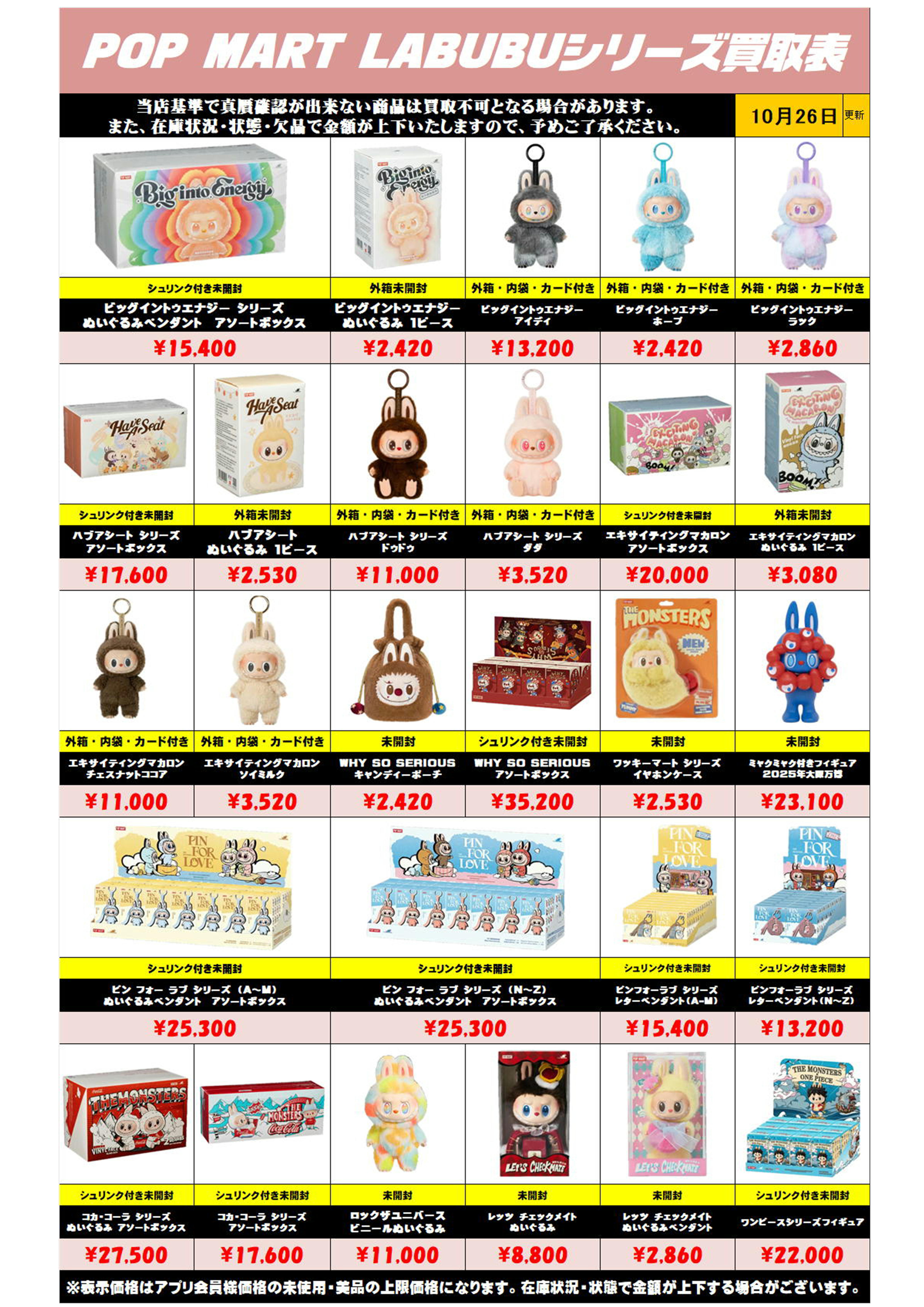 また、在庫状況・状態・欠品などでの金額が変動や、買取上限がございます。予めご了承ください。
