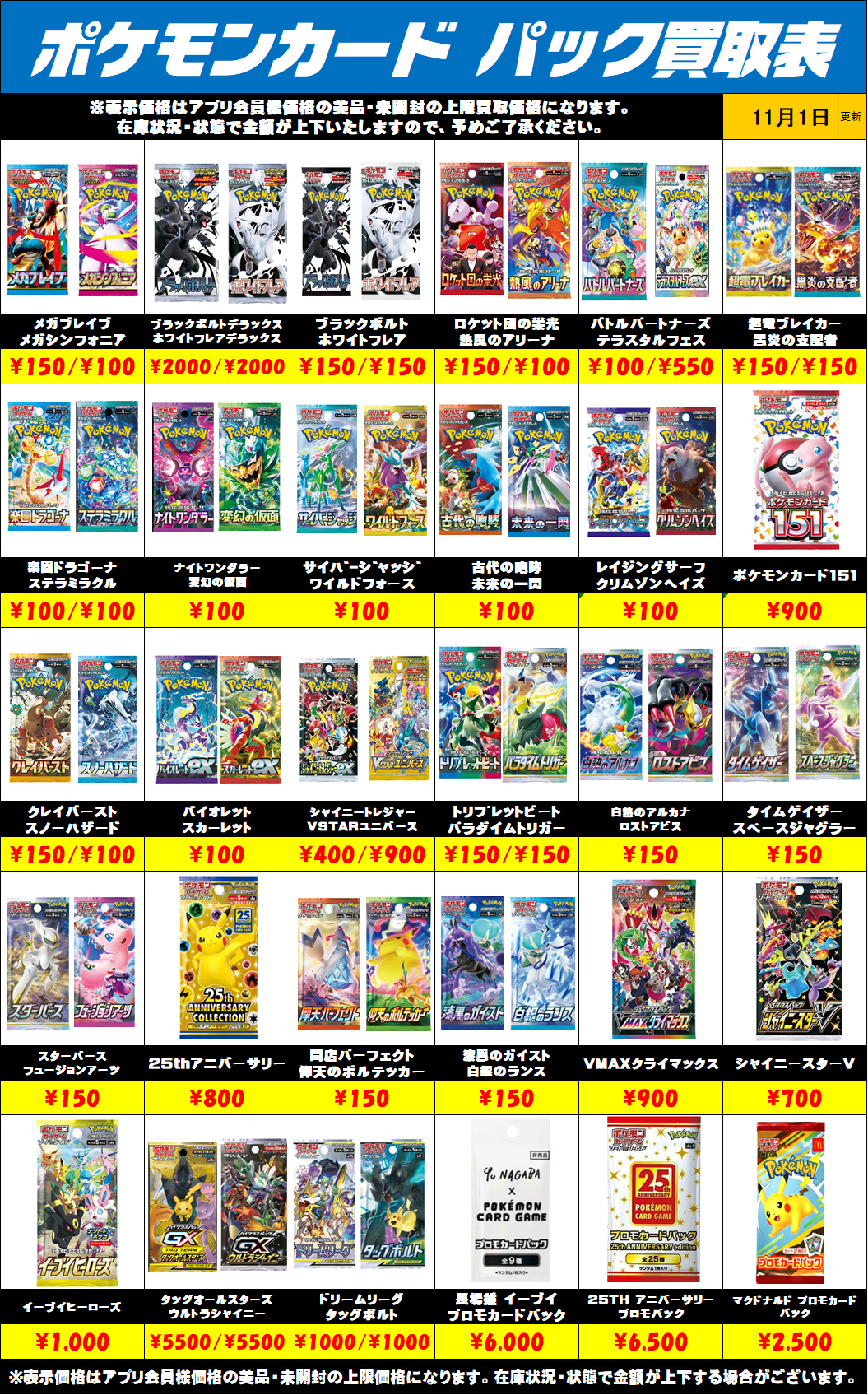 予告なく在庫により金額が上下する場合がございます。 値段表記がないパックに関しましては、現在買取を行っていないものになります。ご了承ください。