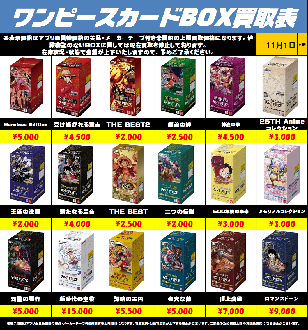 未開封・美品・メーカーテープ付きの店頭・アプリ会員様の買取価格を表示しております。 BOXの状態によりお買取り出来ない場合もございます。値段表記のないBOXに関しましては、現在買取を停止しております。