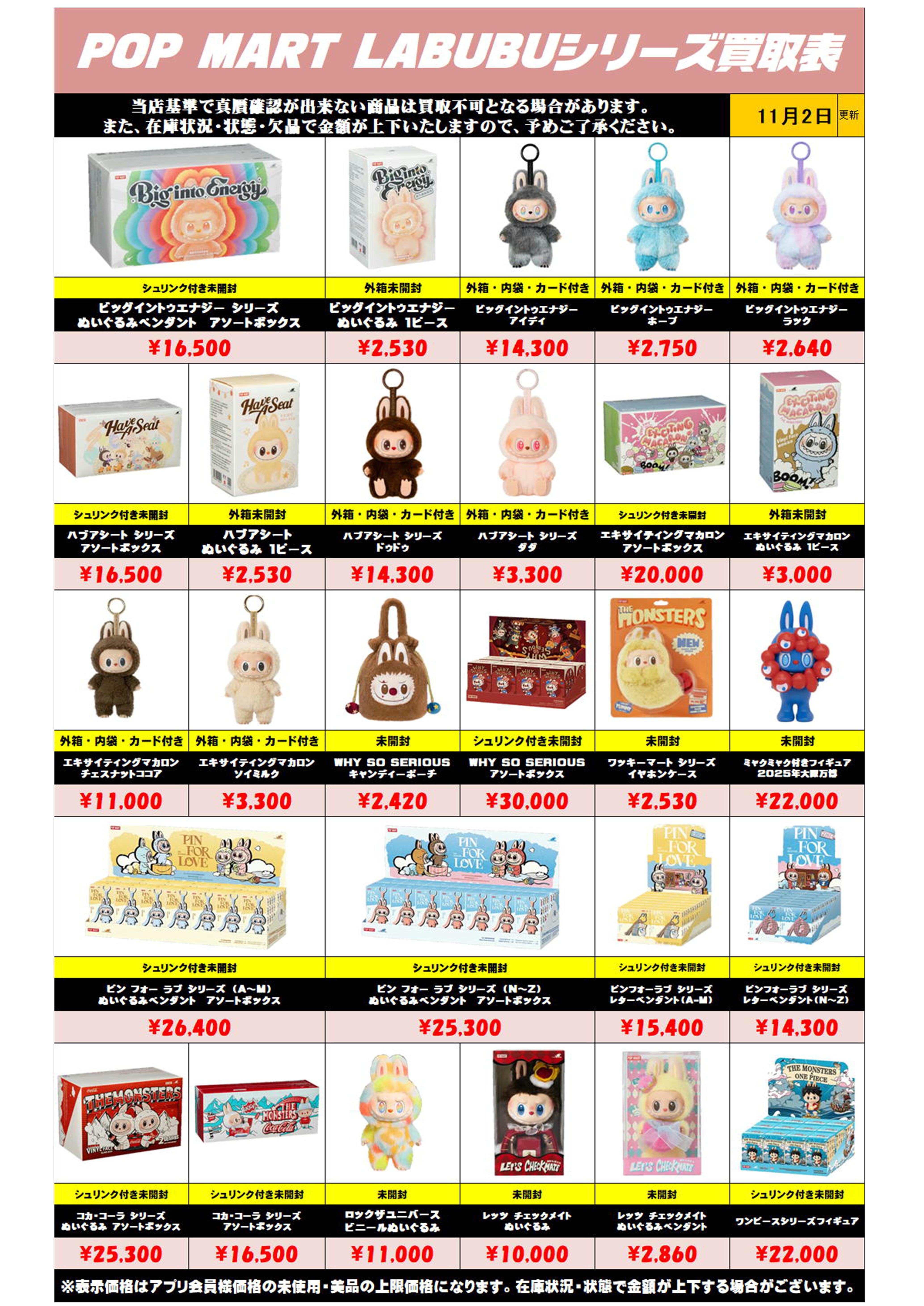 また、在庫状況・状態・欠品などでの金額が変動や、買取上限がございます。予めご了承ください。