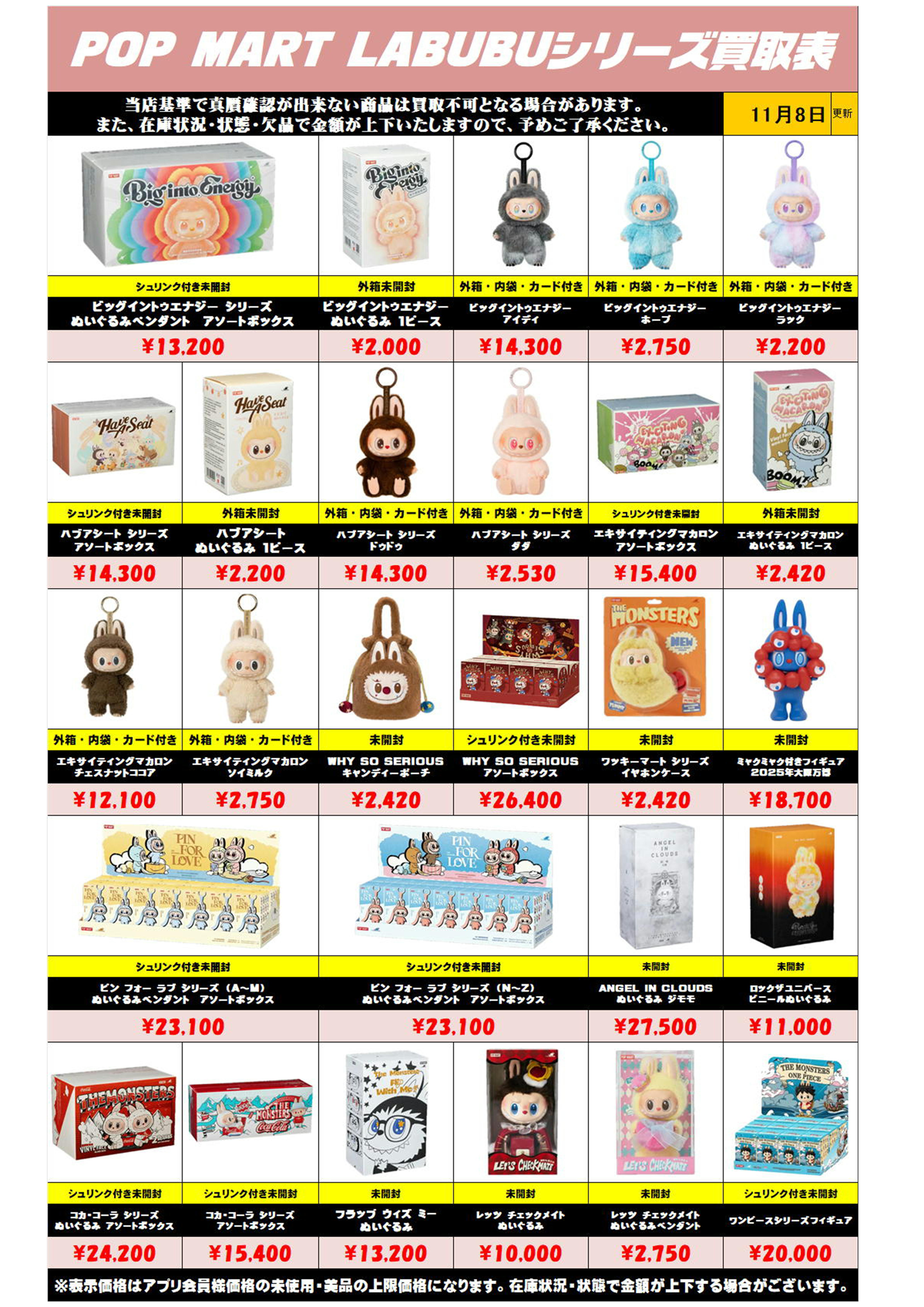 また、在庫状況・状態・欠品などでの金額が変動や、買取上限がございます。予めご了承ください。