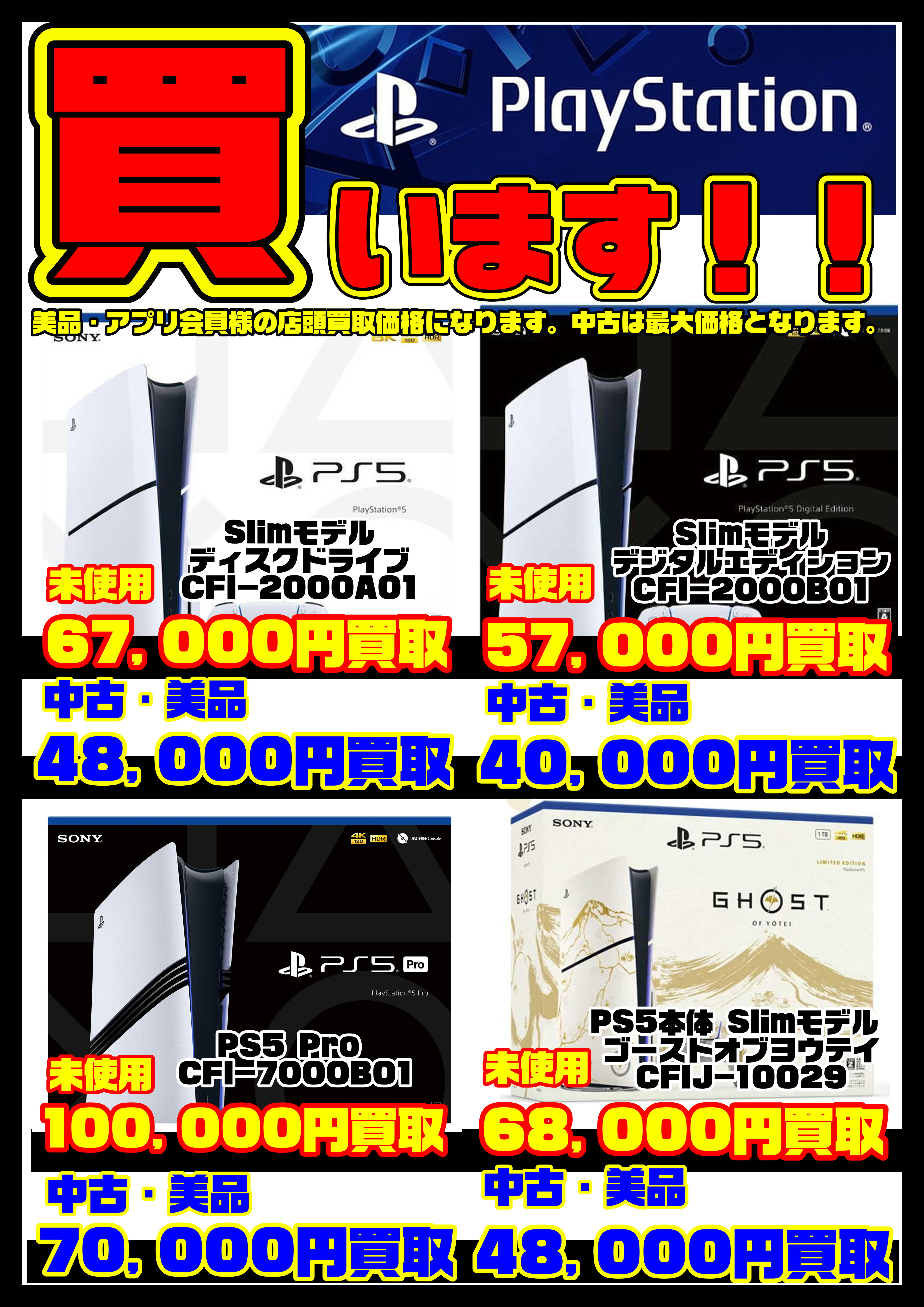| PS5 | PS5本体 ディスクドライブ版 Slimモデル CFI-2000A01 | 67000 | 48000 |