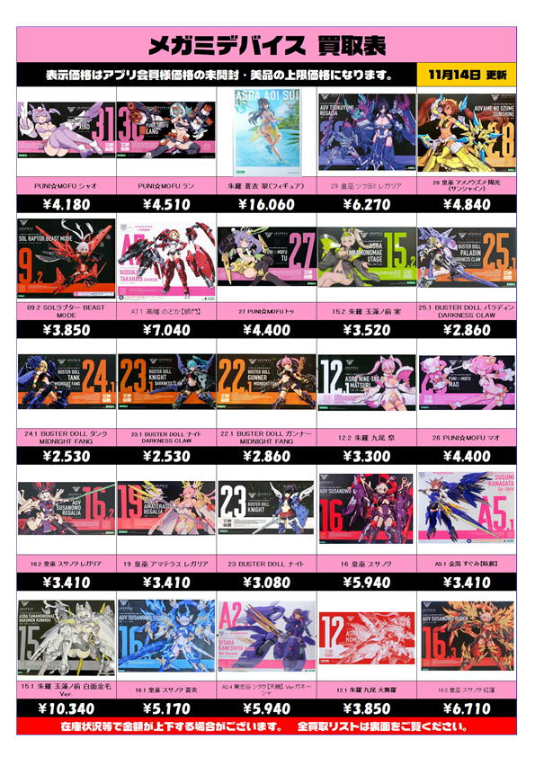 美少女プラモデル メガミデバイス 買取価格更新しました! 11/14~