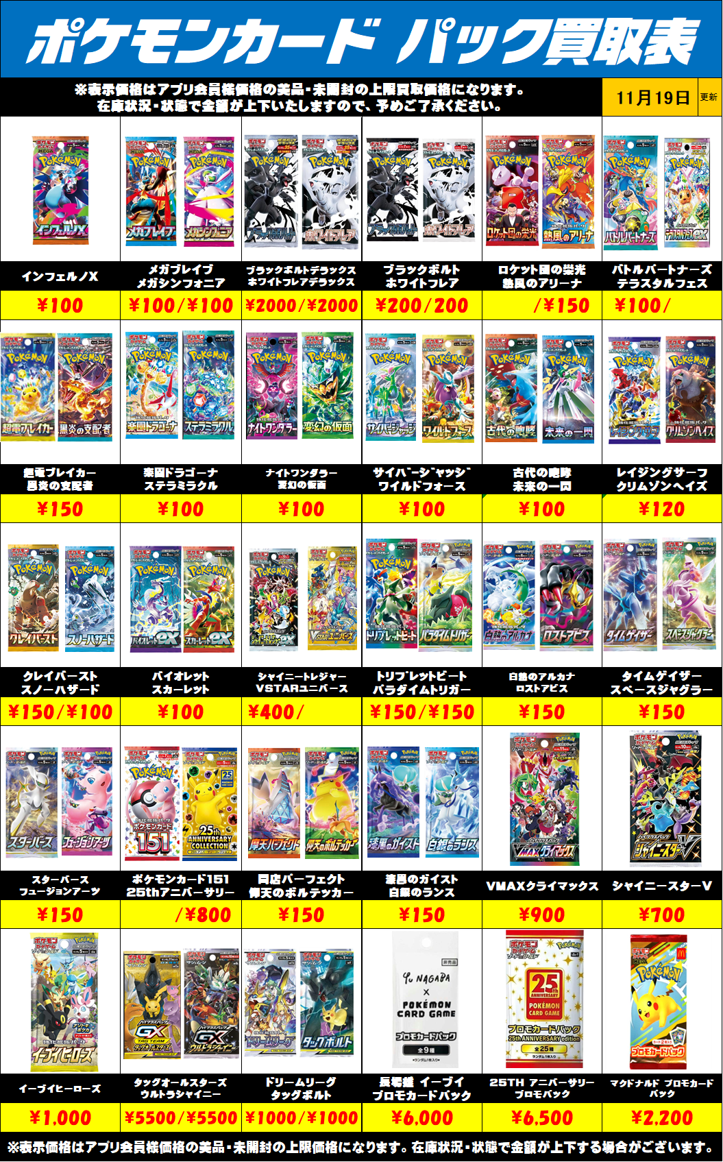 予告なく在庫により金額が上下する場合がございます。 値段表記がないパックに関しましては、現在買取を行っていないものになります。ご了承ください。