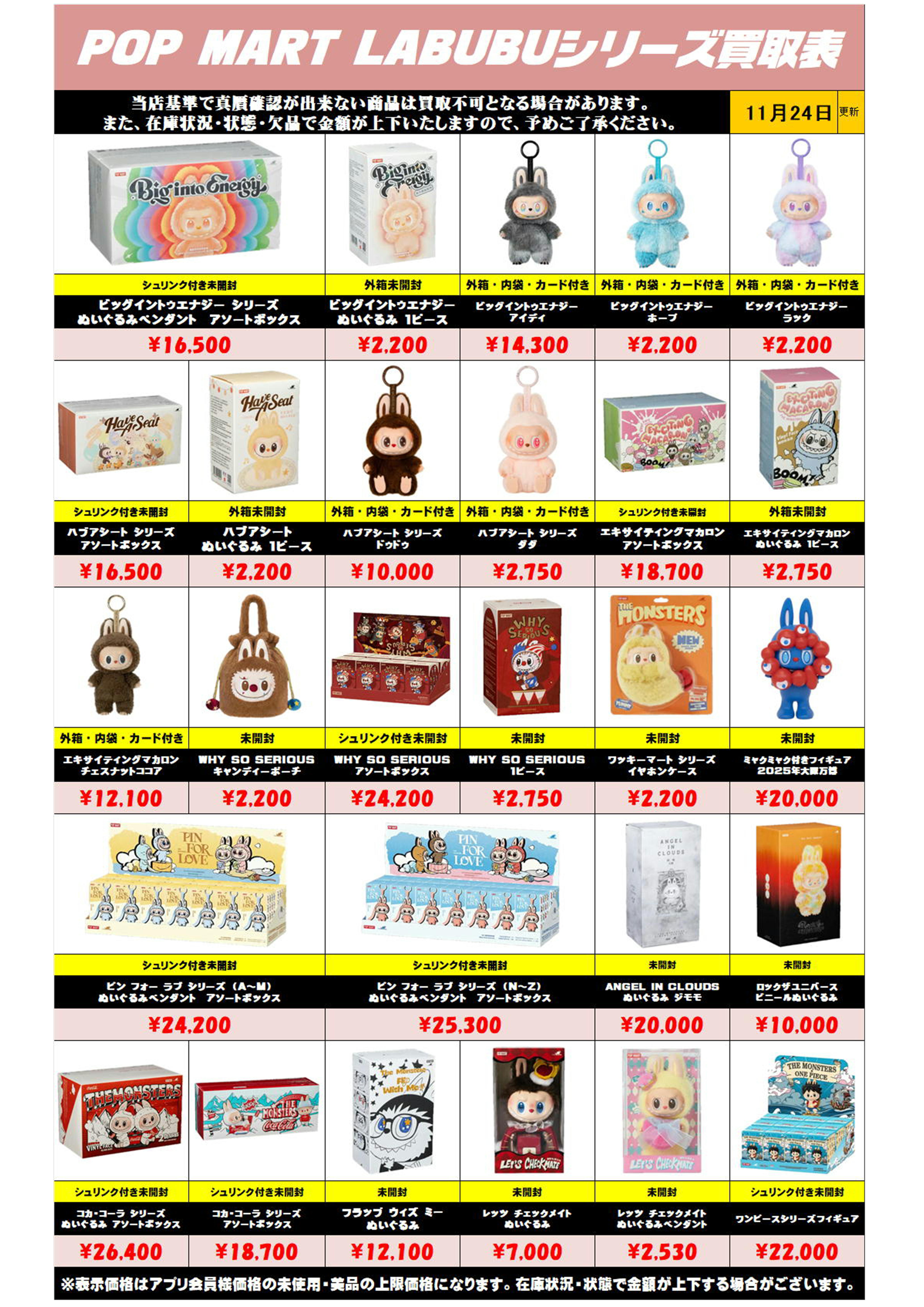 また、在庫状況・状態・欠品などでの金額が変動や、買取上限がございます。予めご了承ください。
