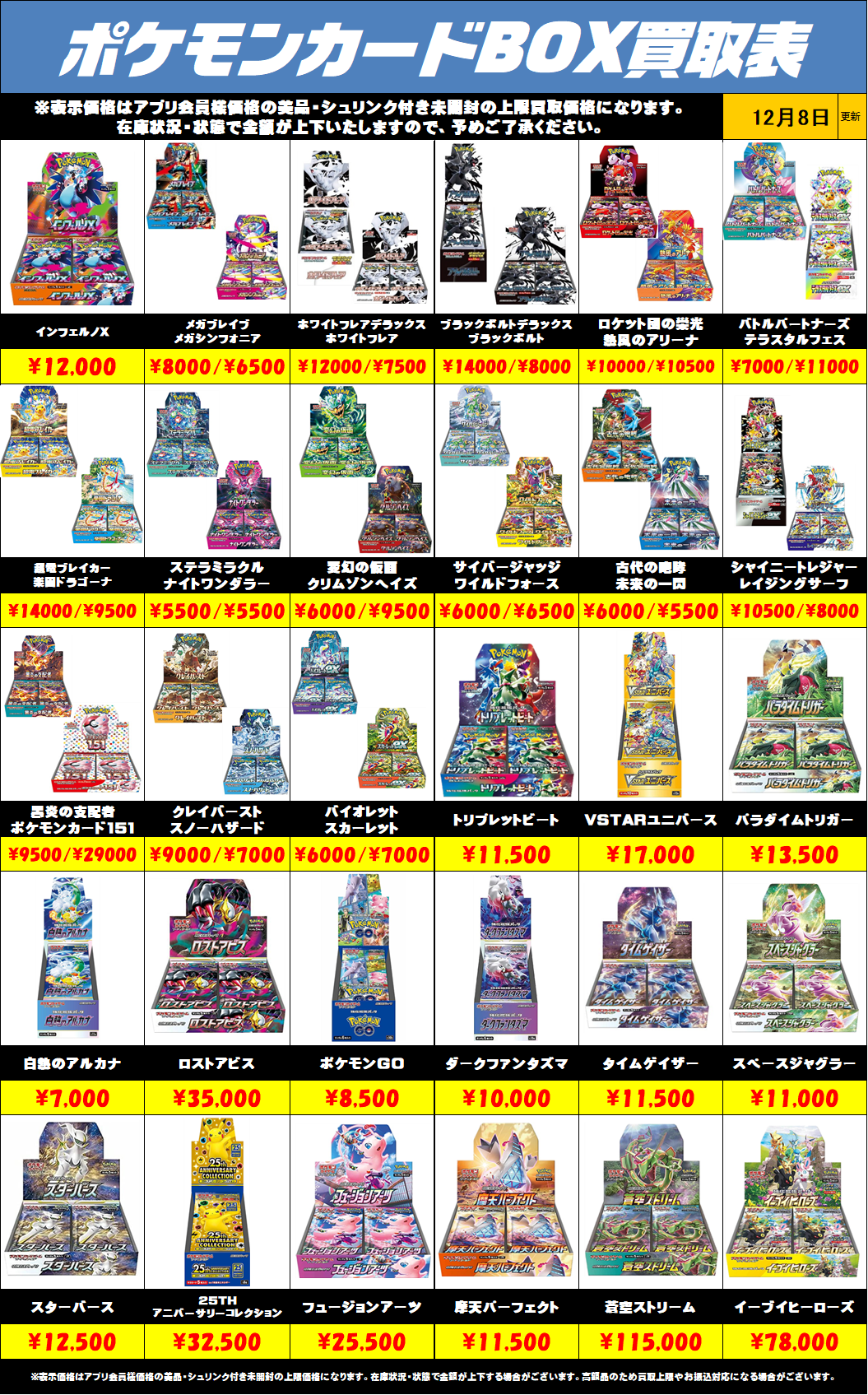 未開封・美品・シュリンク付きの店頭・アプリ会員様の買取価格を表示しております。 在庫により予告なく金額が上下する場合と買取上限や、お振込対応になる場合がございます。 BOX状態や、買取上限により買取を …