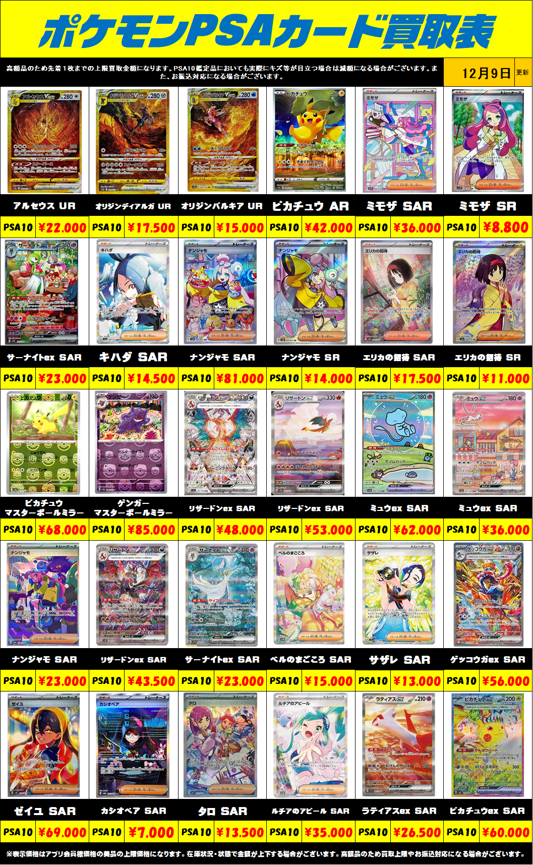 ※表示価格はアプリ会員様・店頭買取の美品の上限価格になります。 相場の変動が激しい為、在庫状況・状態・相場等で金額が予告なく大きく変動する場合がございます。PSAは、おひとり様最大で1日20万円までのお買取りになります。