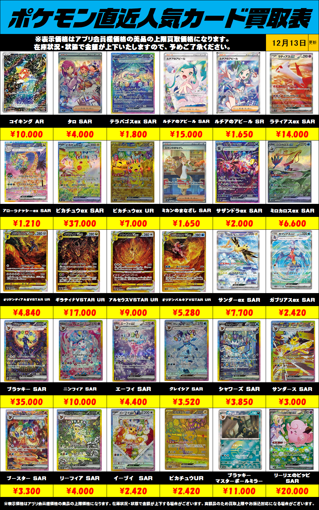 ピカチュウ ¥48000買取 ゲンガー ¥30000買取 イーブイ ¥10000買取 ミュウツー ¥10000買取 ブースター ¥7000買取 サンダース ¥7500買取 シャワーズ ¥8000買取 …