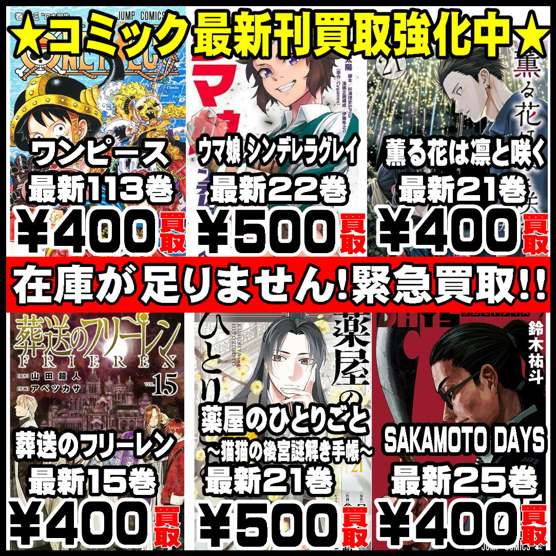本 新刊コミック買取強化中!! 投稿日:2025年12月19日 ※状態、在庫により金額が変更する場合がございます。 在庫が集まり次第終了となる場合がございます。 共有:クリックして Twitter で共有 (新しいウィンドウで開きます)Facebook で共有するにはクリックしてください (新しいウィンドウで開きます) Twitter Facebook Google+ Pocket B!はてブ LINE -本 執筆者:funabashi
