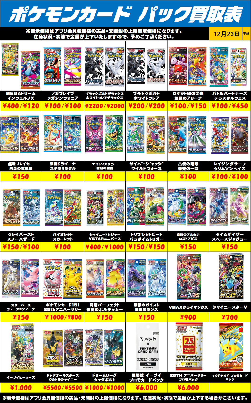 予告なく在庫により金額が上下する場合がございます。 値段表記がないパックに関しましては、現在買取を行っていないものになります。ご了承ください。