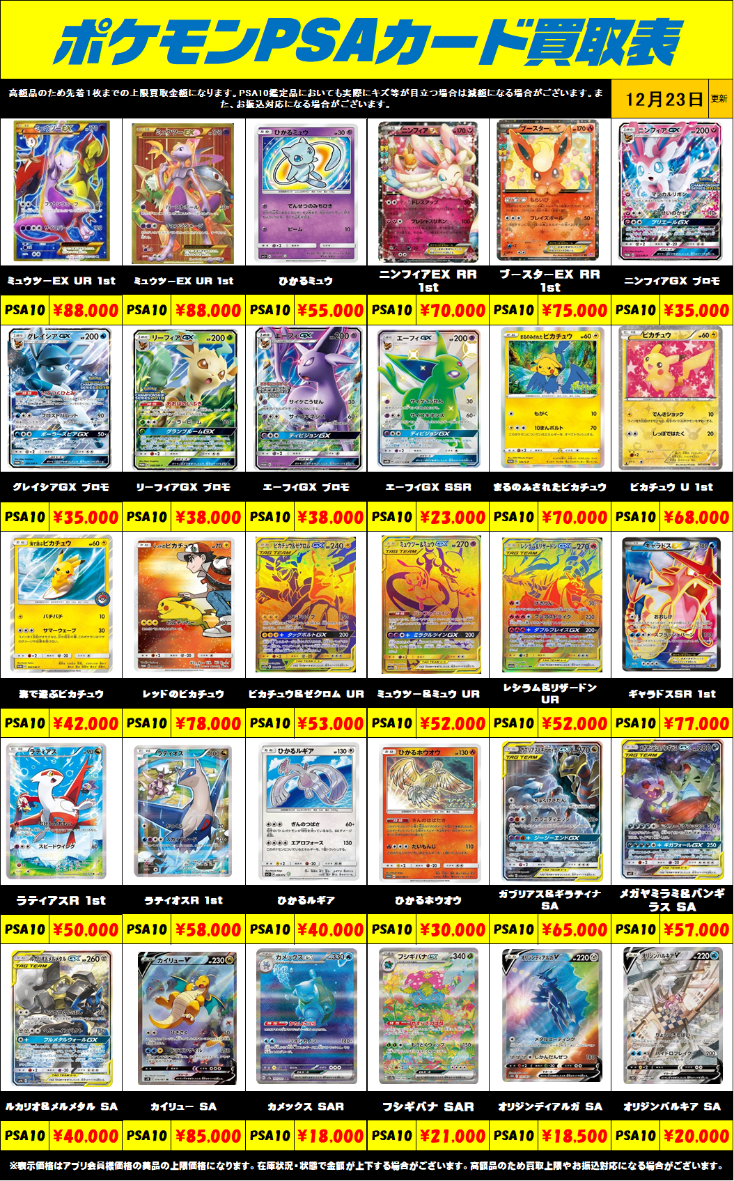 ※表示価格はアプリ会員様・店頭買取の美品の上限価格になります。 相場の変動が激しい為、在庫状況・状態・相場等で金額が予告なく大きく変動する場合がございます。PSAは、おひとり様最大で1日20万円までのお買取りになります。