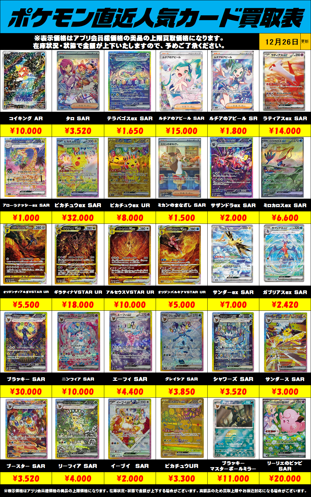 リザードンex SAR ¥22000買取 ポピー SAR ¥2500買取 リザードンex UR ¥5000買取 パラソルおねえさん SAR \13000買取 チリ SAR \6000買取 ガブリアスe …