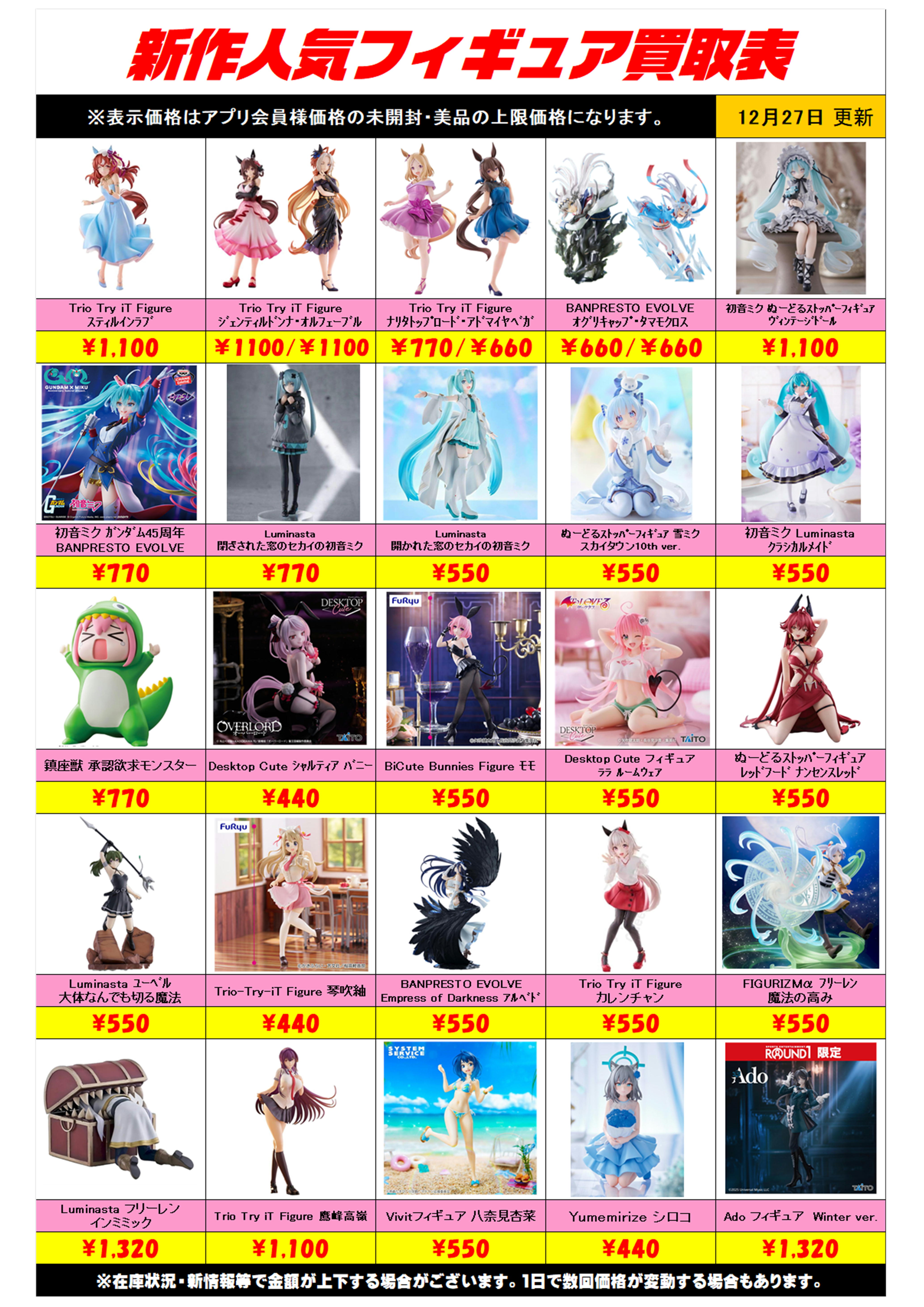 新作プライズフィギュア買取リスト更新しました! 12/27~ プラスアップキャンペーンも実施中です!