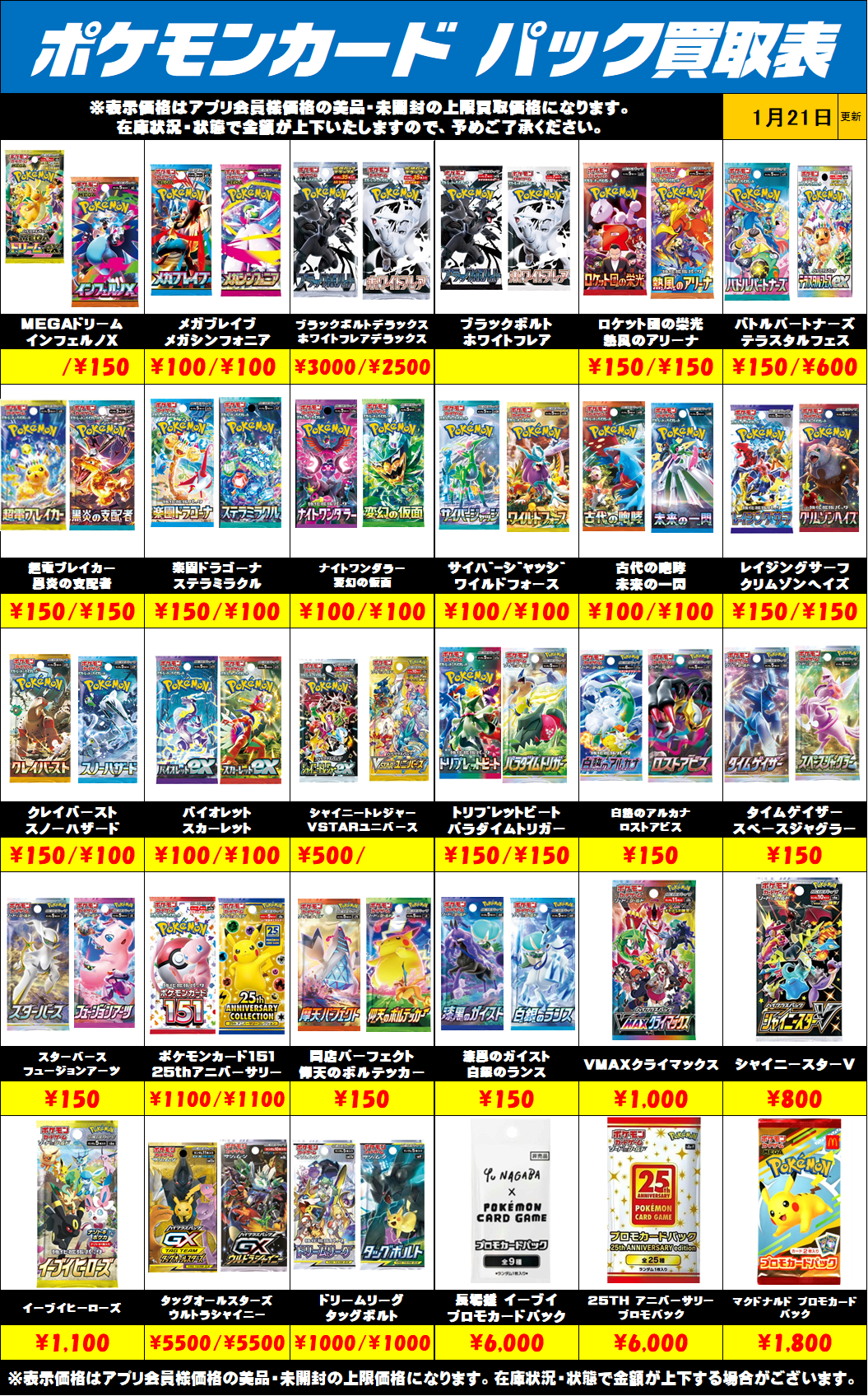 予告なく在庫により金額が上下する場合がございます。 値段表記がないパックに関しましては、現在買取を行っていないものになります。ご了承ください