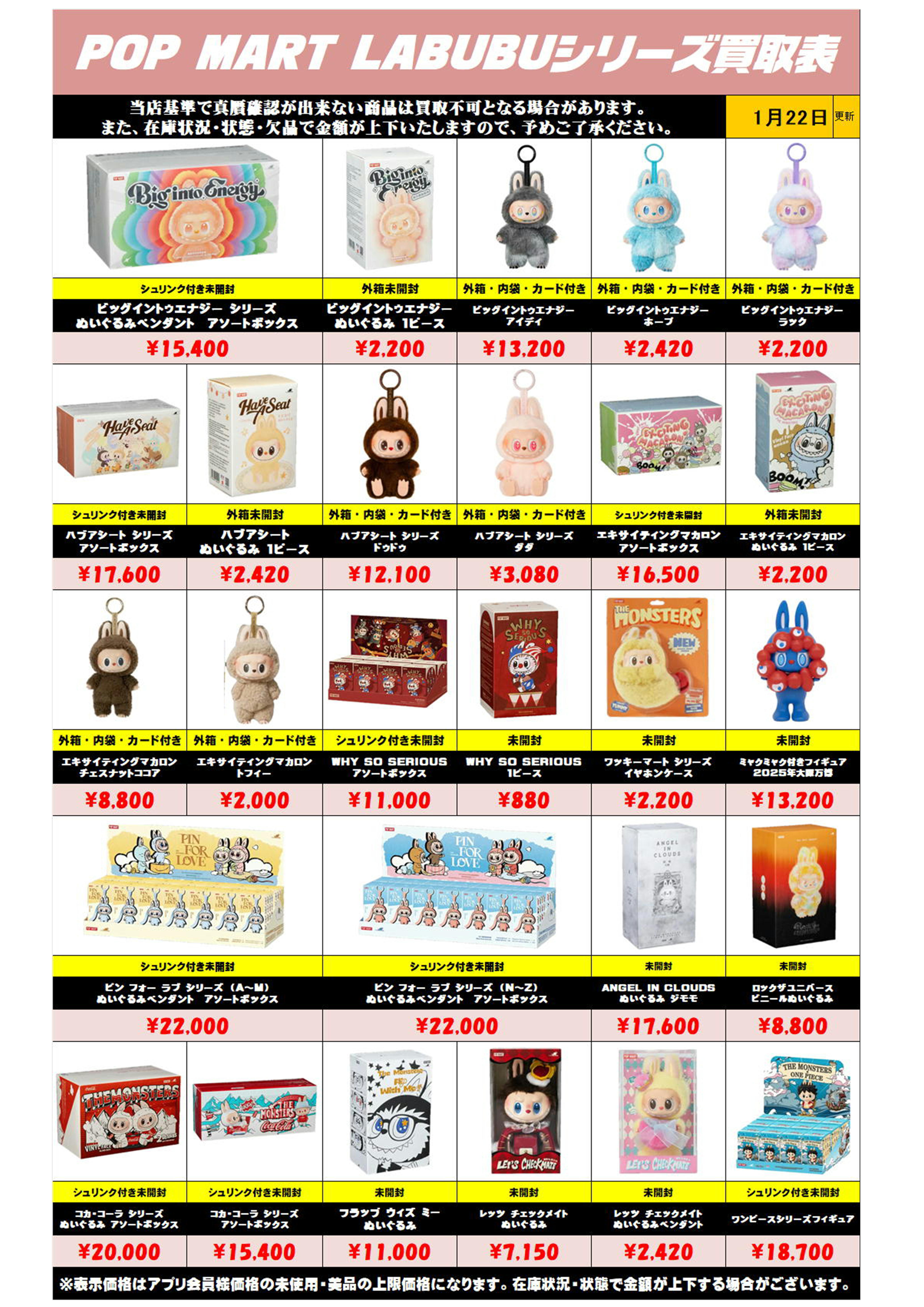 また、在庫状況・状態・欠品などでの金額が変動や、買取上限がございます。予めご了承ください。