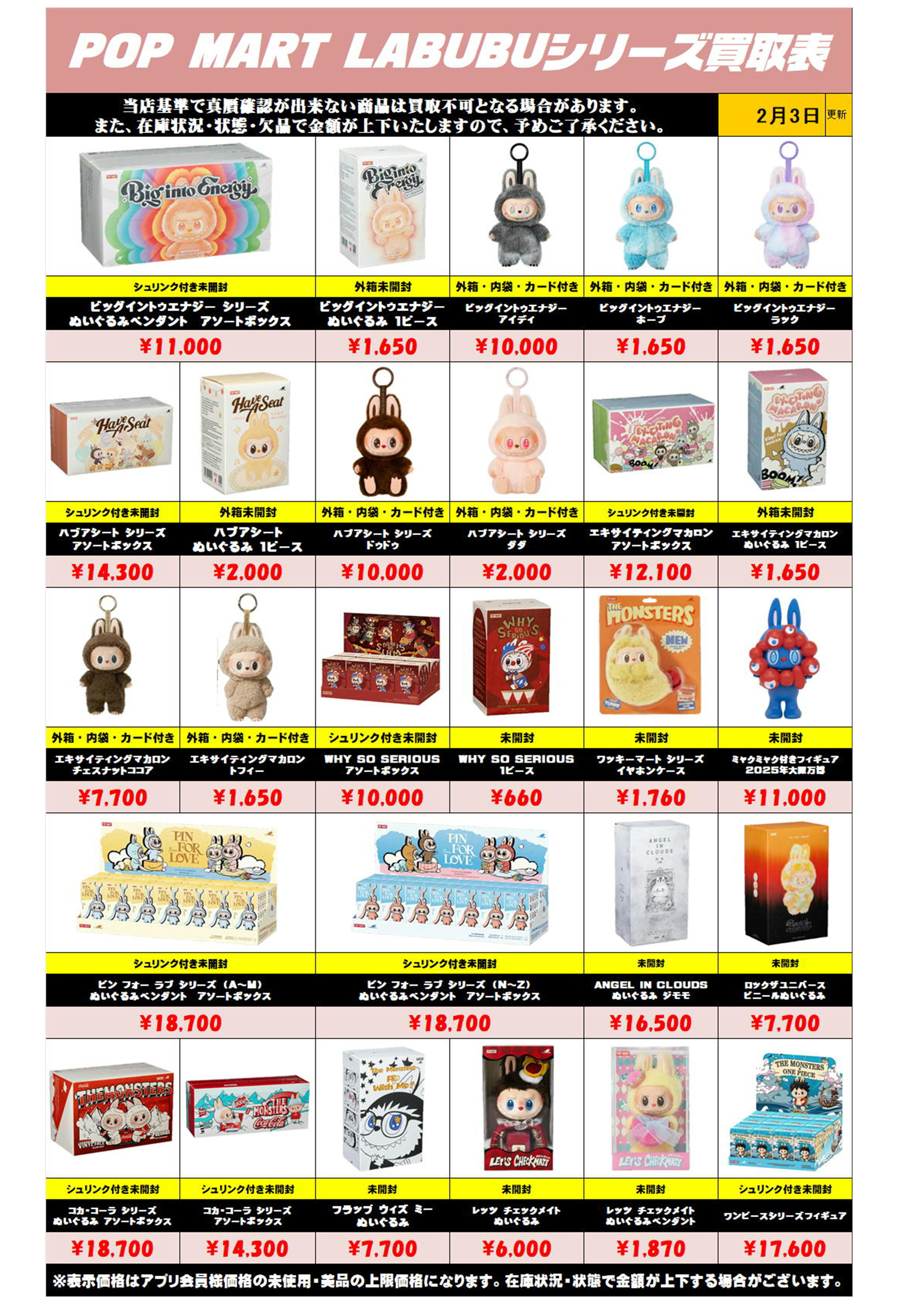 また、在庫状況・状態・欠品などでの金額が変動や、買取上限がございます。予めご了承ください。