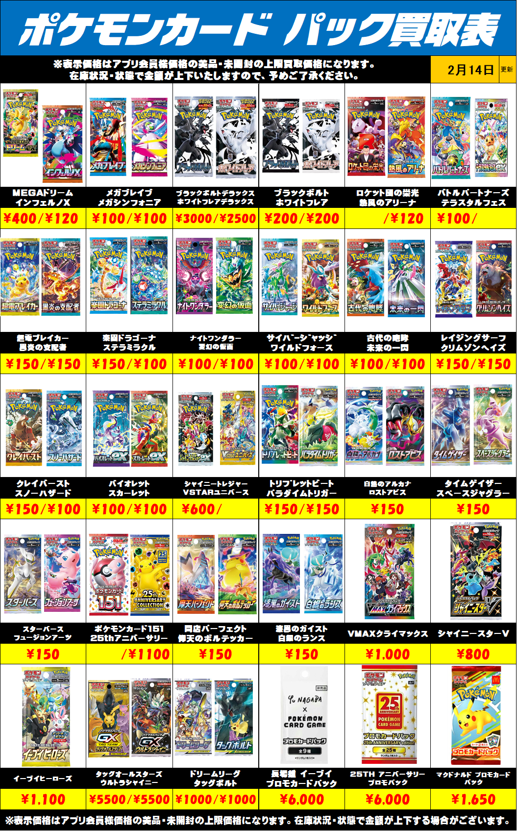 予告なく在庫により金額が上下する場合がございます。 値段表記がないパックに関しましては、現在買取を行っていないものになります。ご了承ください。