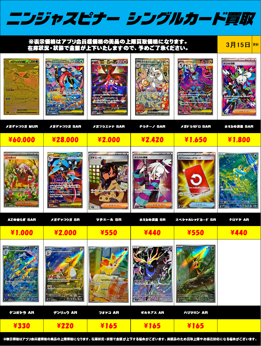 トレカ 買取情報 ポケモンカード新弾ニンジャスピナー シングルカード更新しました! 3/15~ 投稿日:2026年3月14日 ※表示価格はアプリ会員様・店頭買取の美品の上限価格になります。在庫状況・状態・相場で金額が予告なく変動する場合がございます。 Twitter Facebook Google+ Pocket B!はてブ LINE -トレカ, 買取情報 執筆者:funabashi