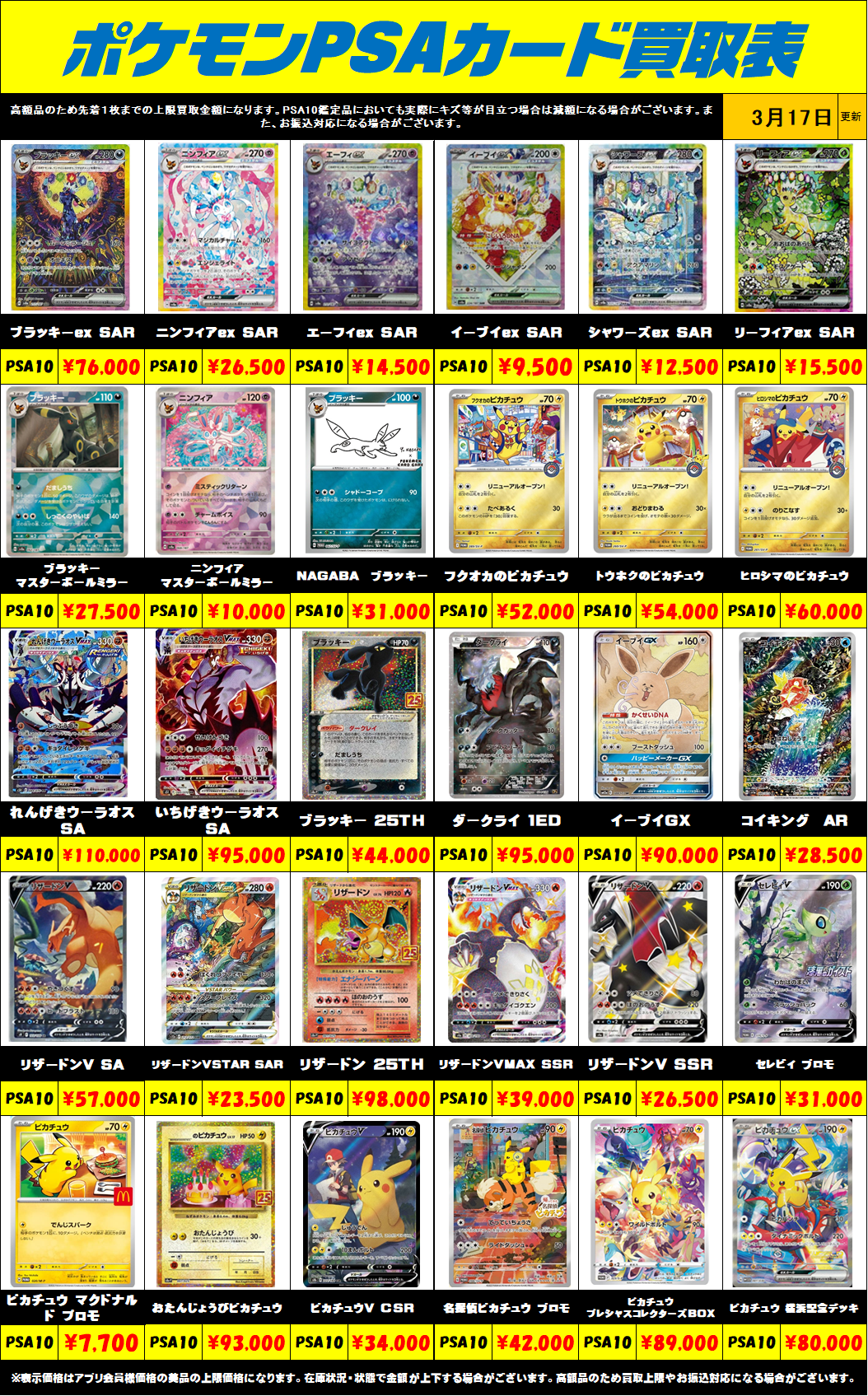 ※表示価格はアプリ会員様・店頭買取の美品の上限価格になります。 相場の変動が激しい為、在庫状況・状態・相場等で金額が予告なく大きく変動する場合がございます。PSAは、おひとり様最大で1日20万円までのお買取りになります。