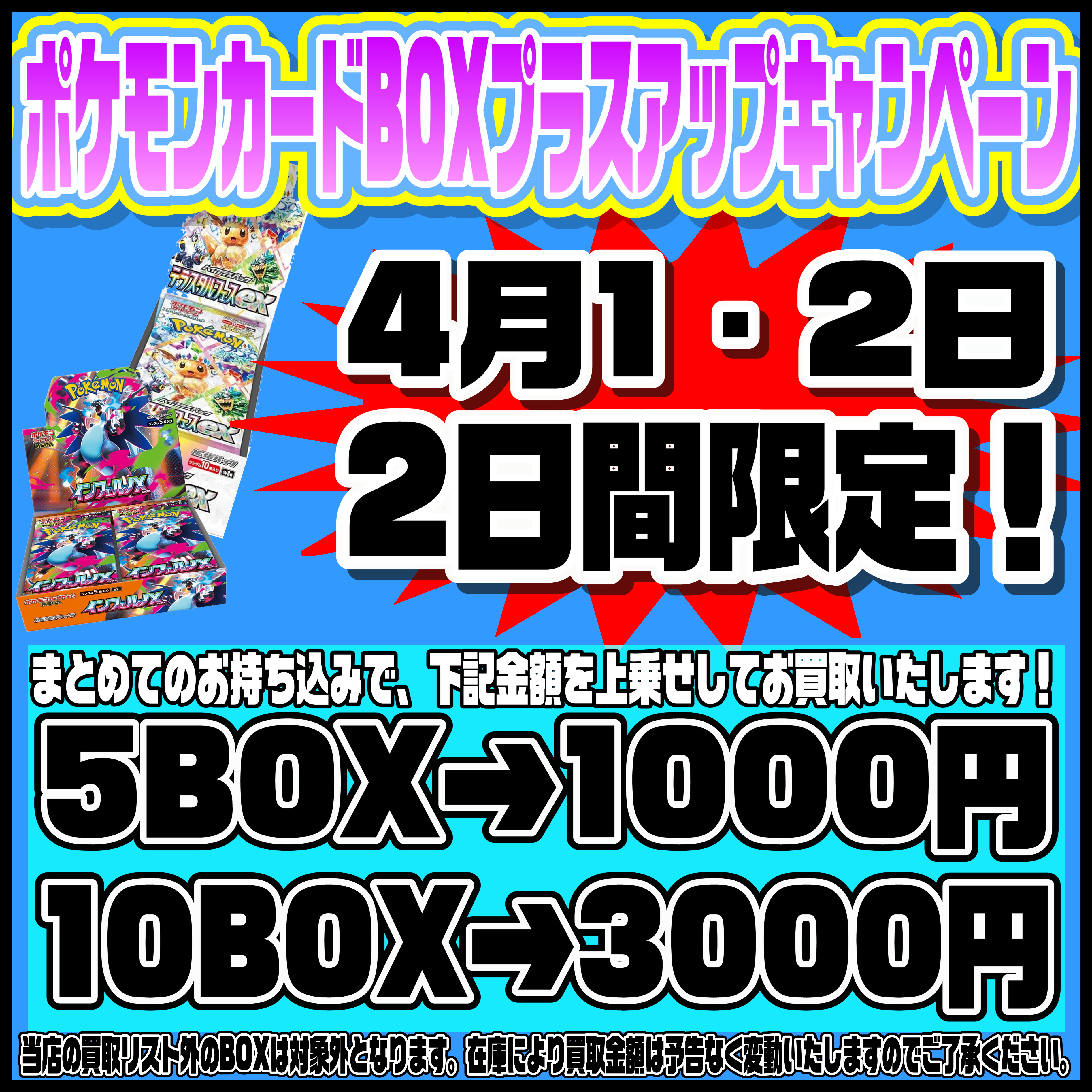 当店の買取リスト外のBOXは対象外となります。在庫.持ち込み数により予定より早くキャンペーンが終わる場合もございます。ご了承ください。