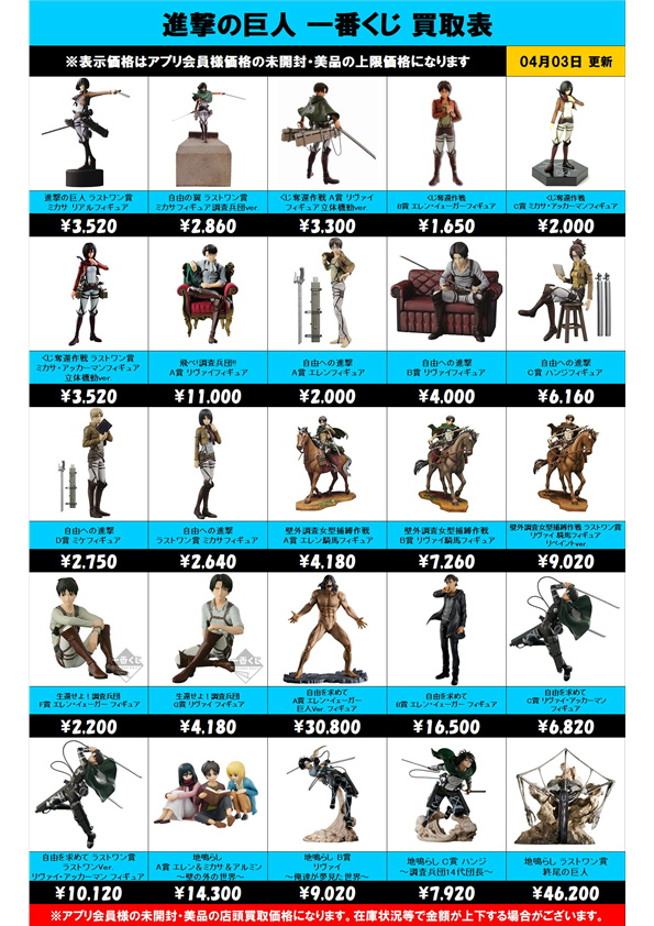 進撃の巨人一番くじ買取表 更新しました! 4/3~