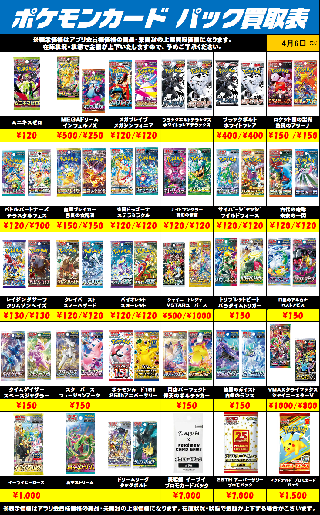 予告なく在庫により金額が上下する場合がございます。 値段表記がないパックに関しましては、現在買取を行っていないものになります。ご了承ください。