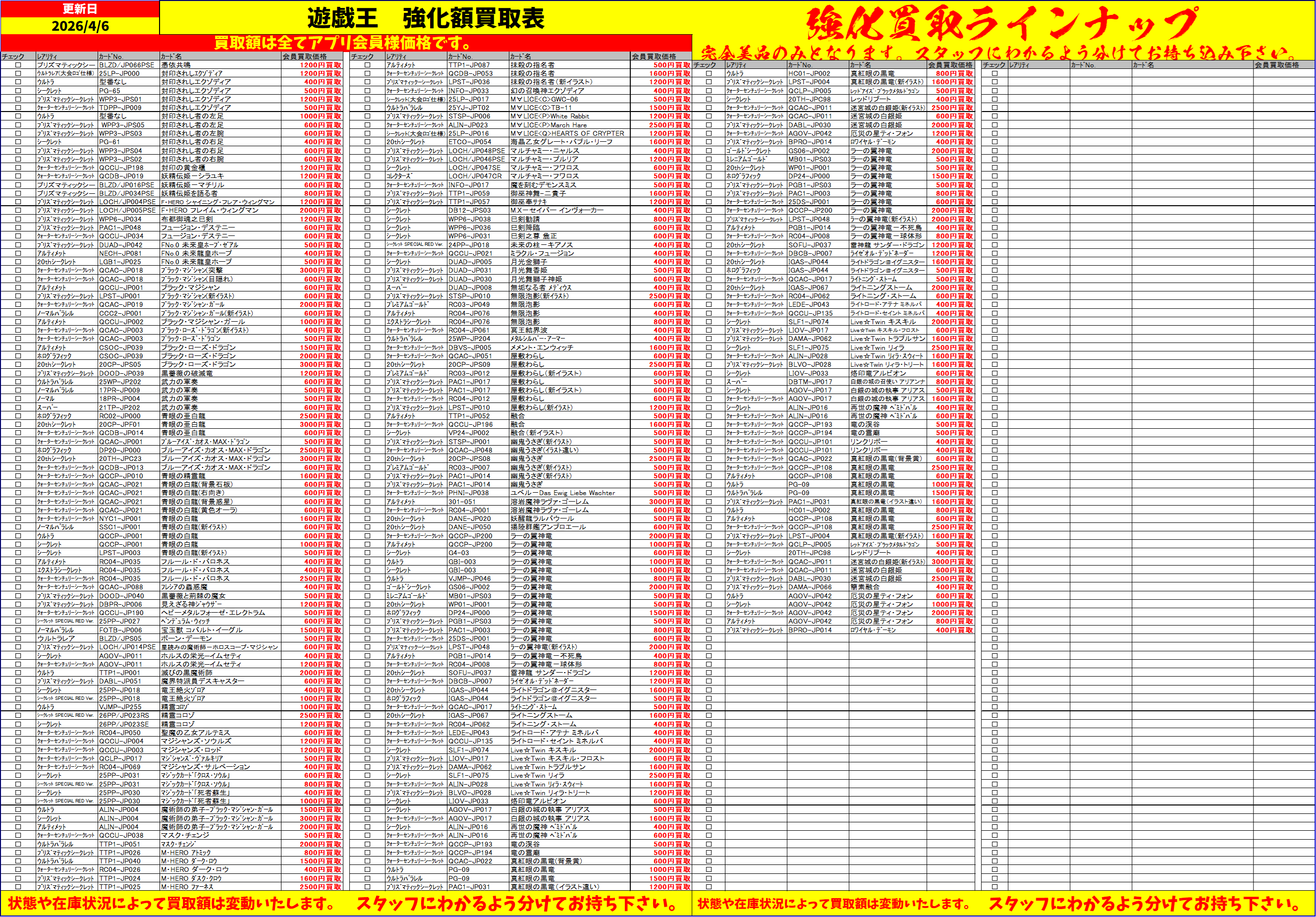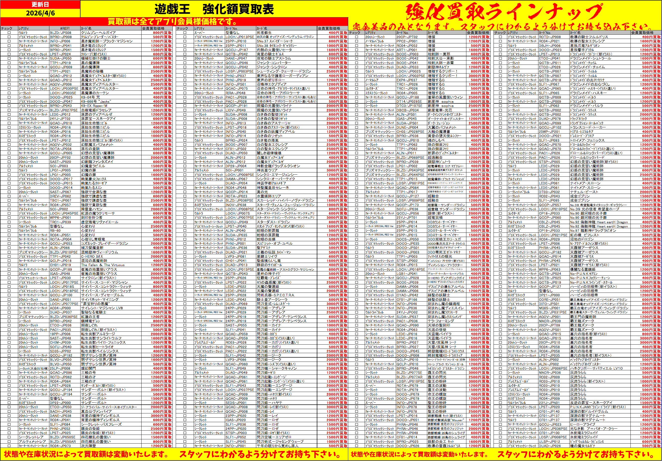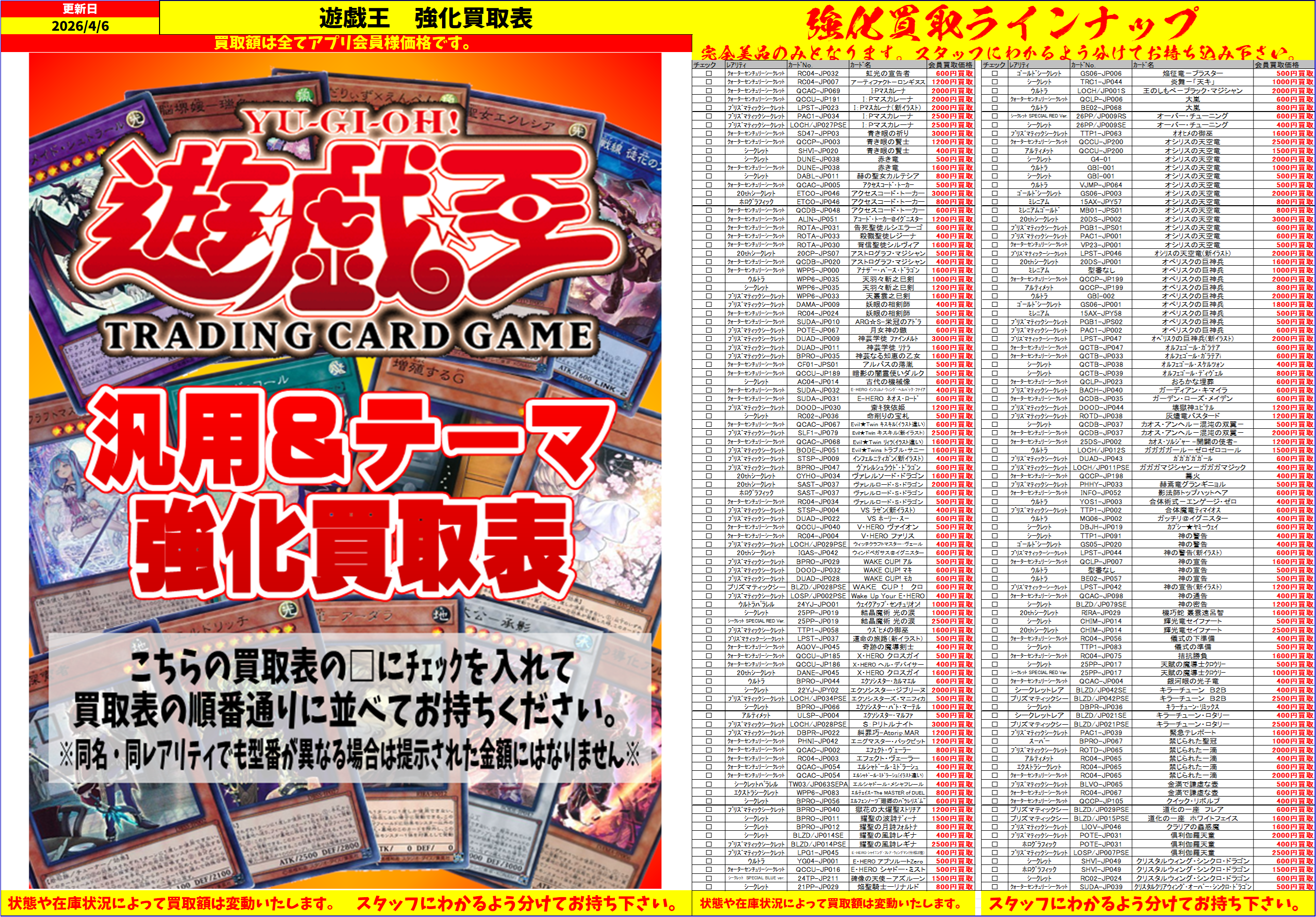 ご自身で印刷もしくは、店頭にある買取表にチェックマークをいれてカードと一緒にお持ちください。