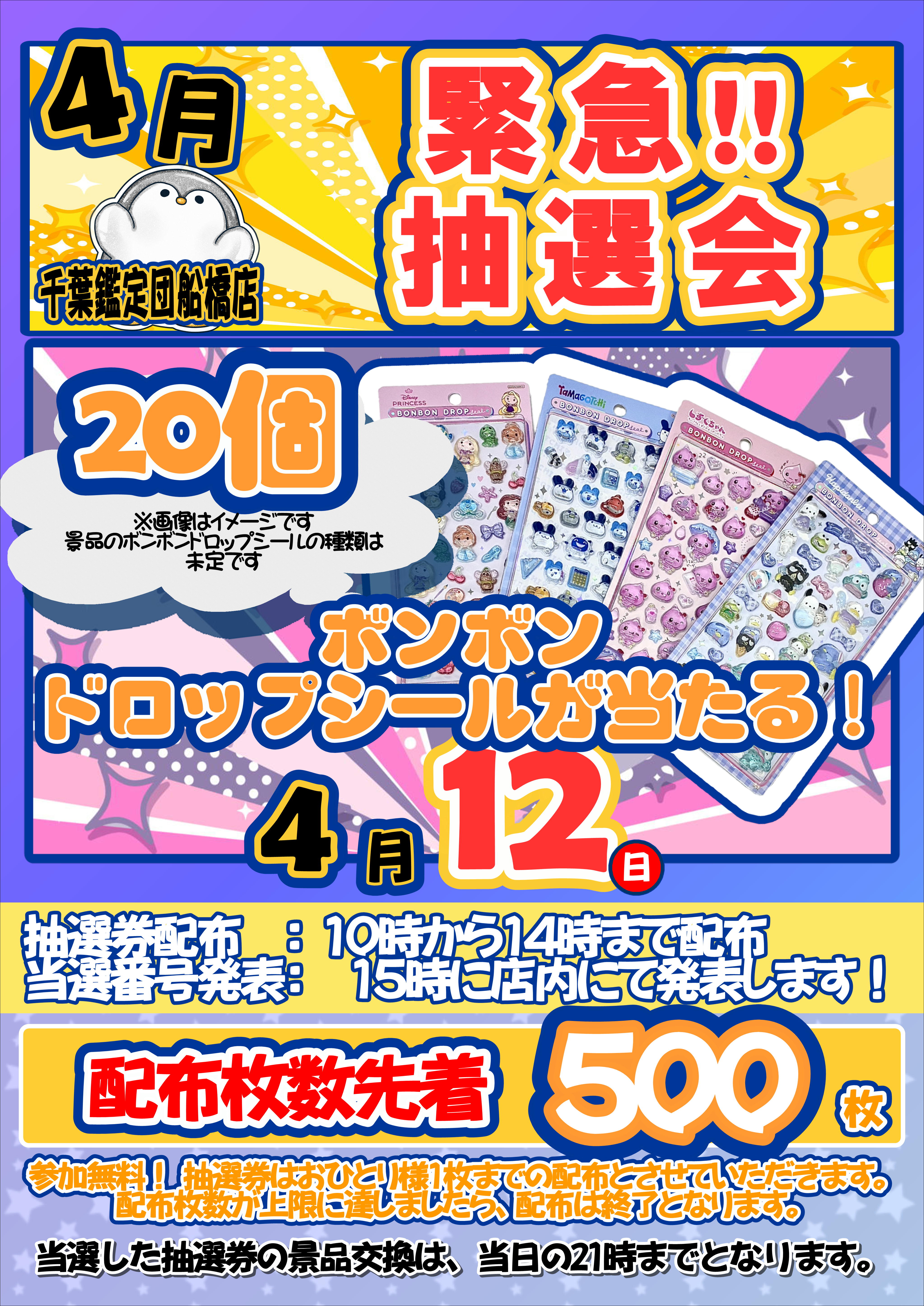 緊急!4/12限定! ボンボンドロップシールが当たる抽選会!!