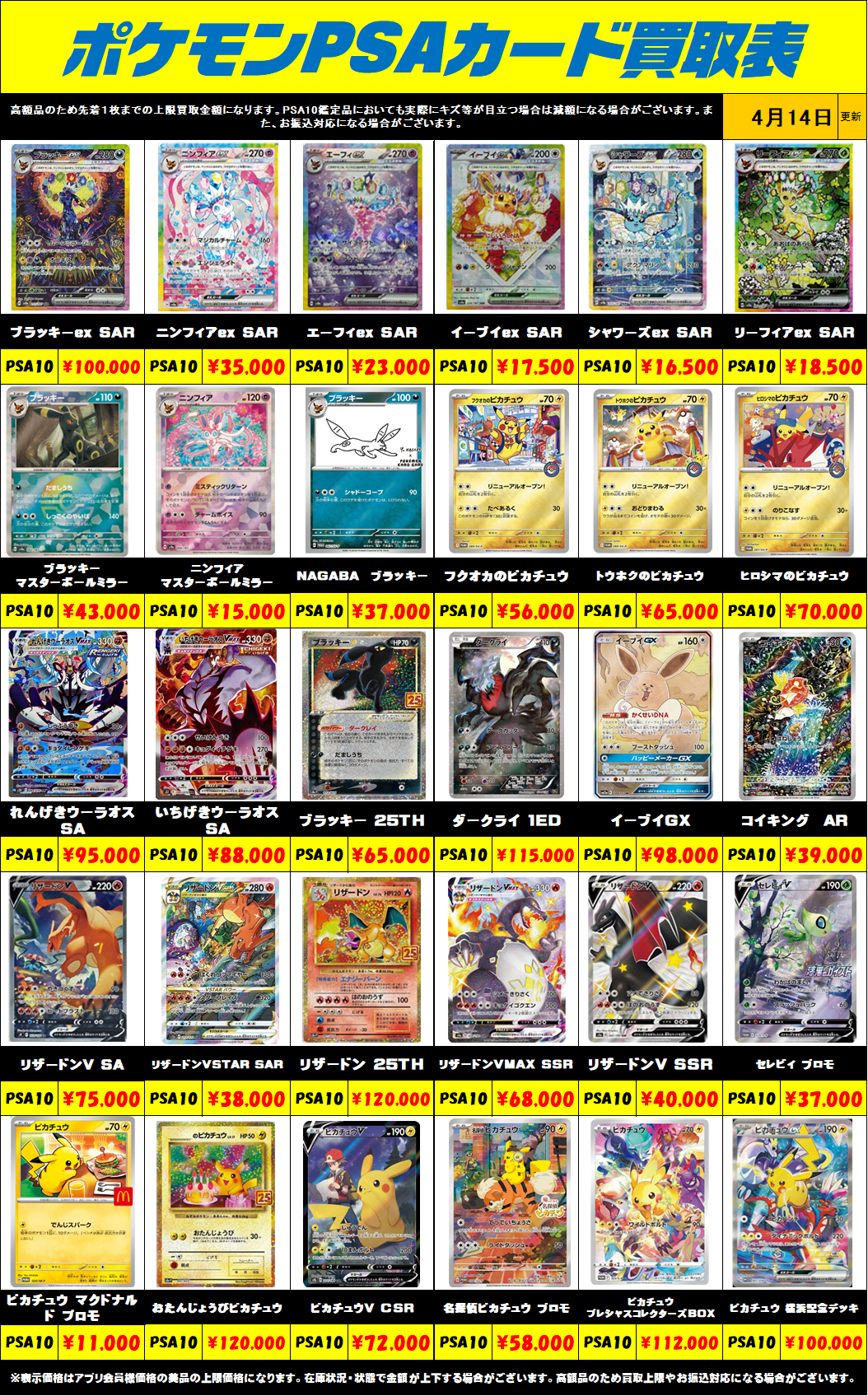 ※表示価格はアプリ会員様・店頭買取の美品の上限価格になります。 相場の変動が激しい為、在庫状況・状態・相場等で金額が予告なく大きく変動する場合がございます。PSAは、おひとり様最大で1日20万円までのお買取りになります。