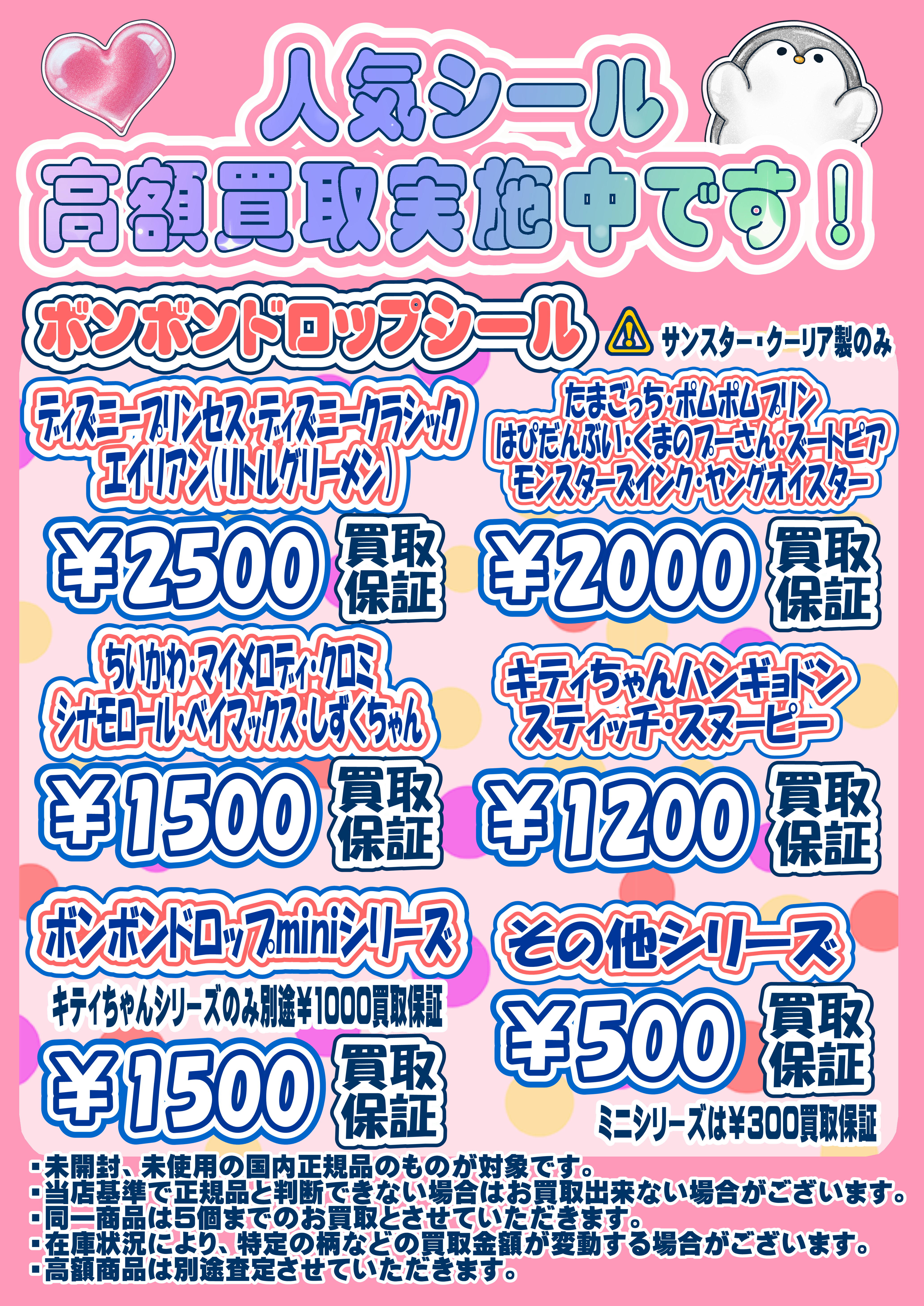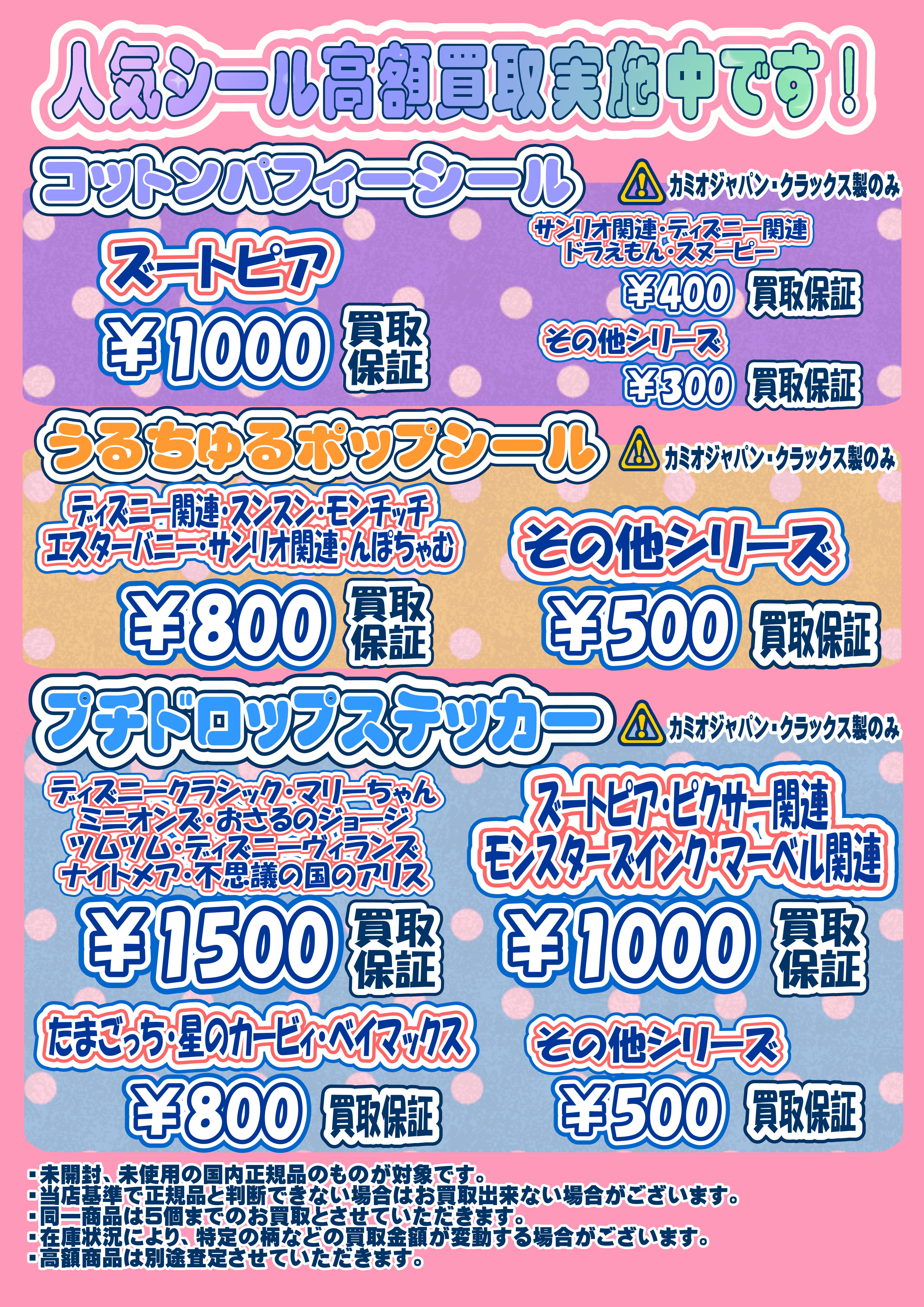 ・在庫状況により、特定の柄などの買取金額が変動する場合がございます。
