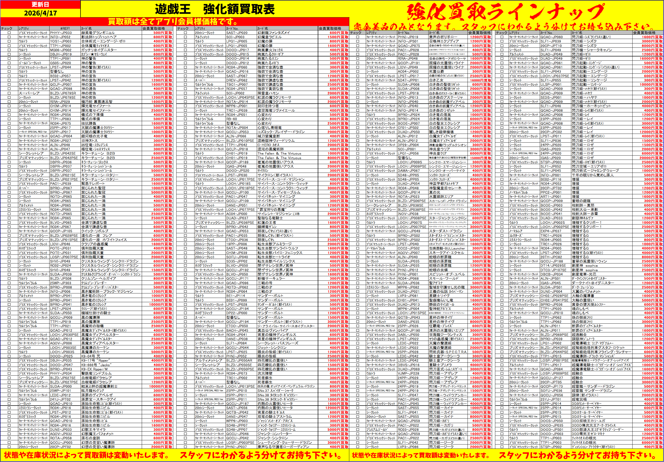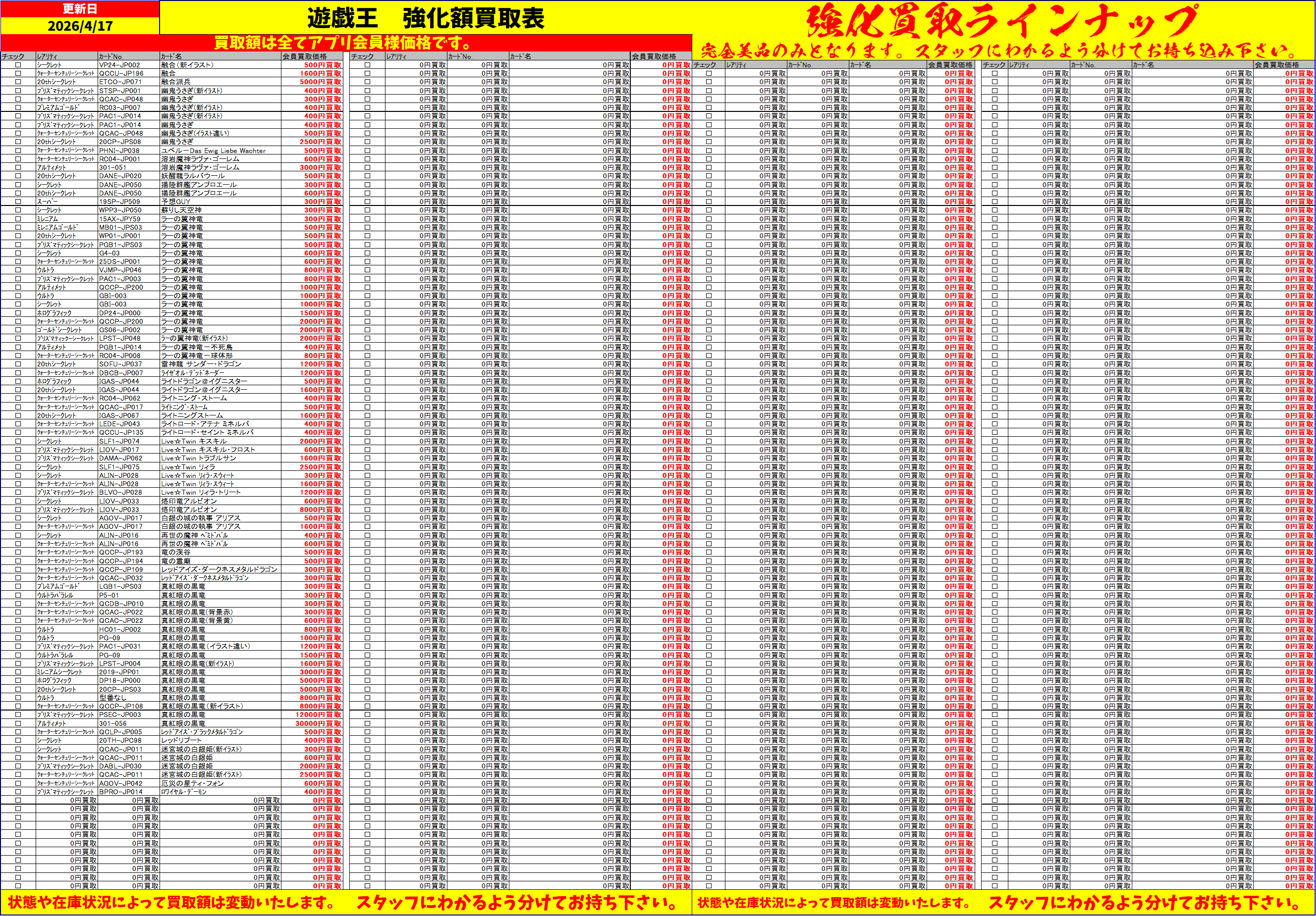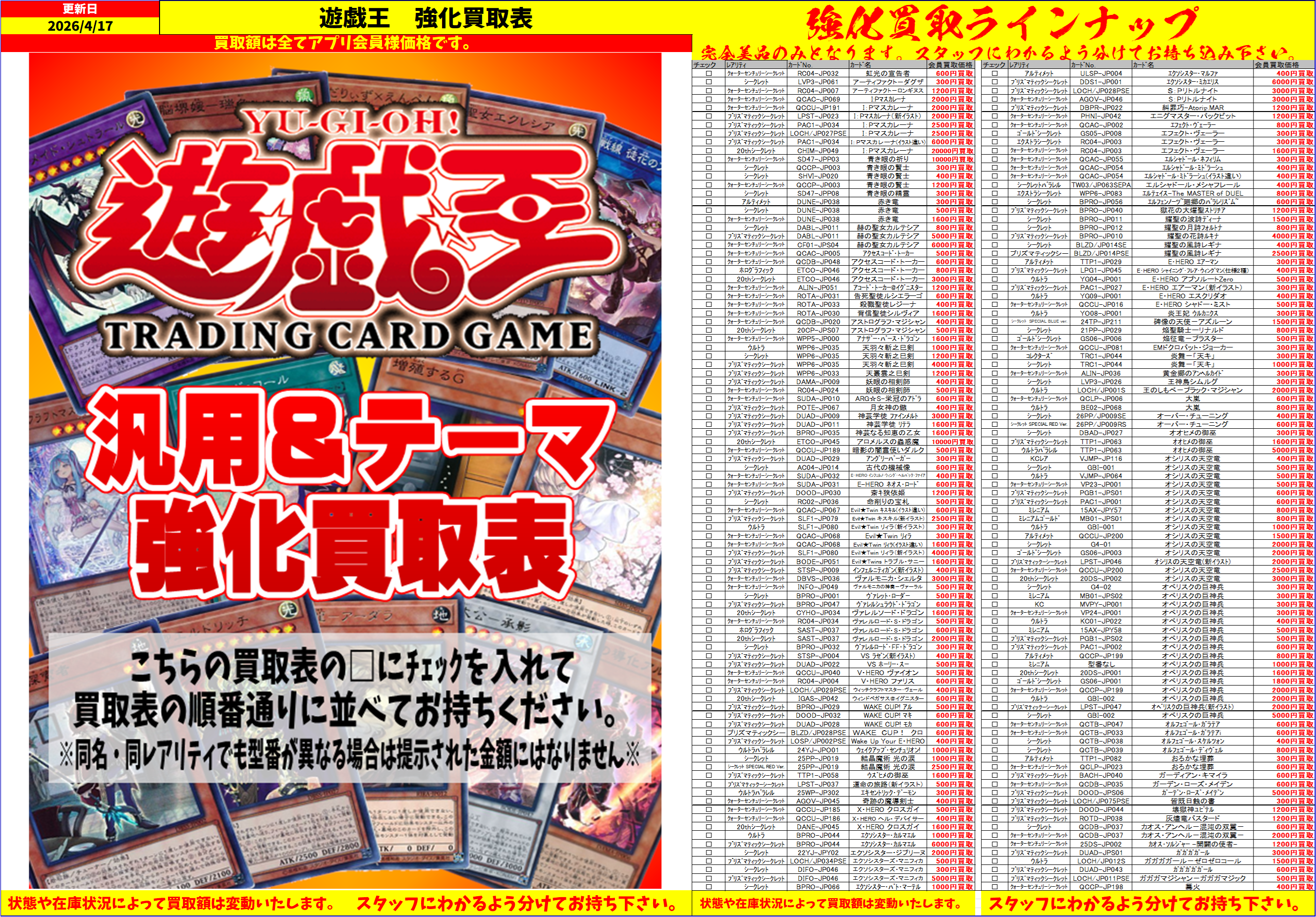 ご自身で印刷もしくは、店頭にある買取表にチェックマークをいれてカードと一緒にお持ちください。