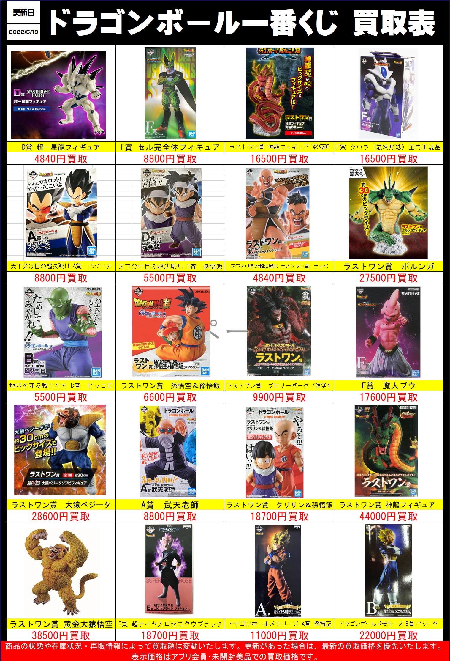商品名 買取金額 一番くじ ドラゴンボールメモリーズ A賞 超サイヤ人孫悟空フィギュア 11000 一番くじ ドラゴンボールメモリーズ B賞 超サイヤ人ベジータフィギュア 22000 一番くじ ドラゴ …